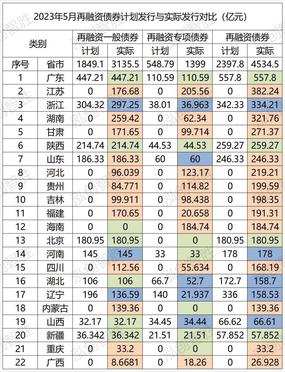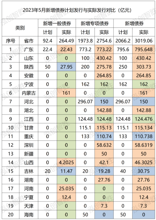 标橙色表示实际发行规模较计划发行规模有所上升,标绿色表示实际发行规模与计划发行规模相等,标蓝色表示实际发行规模较计划发行规模有所下降。