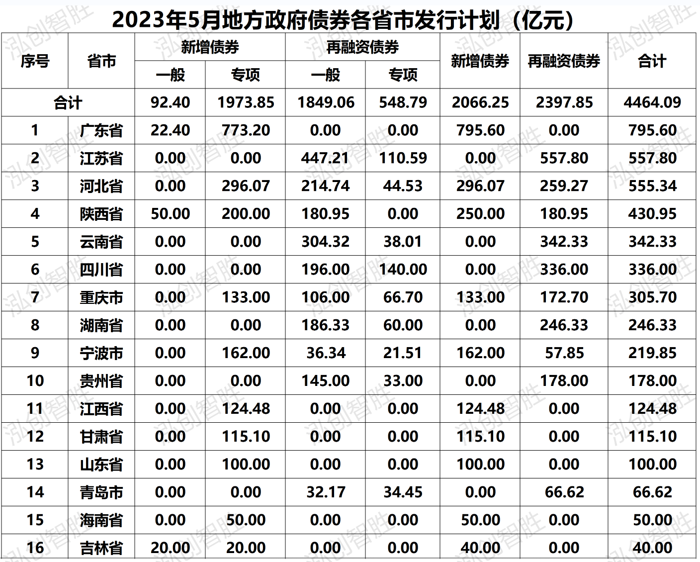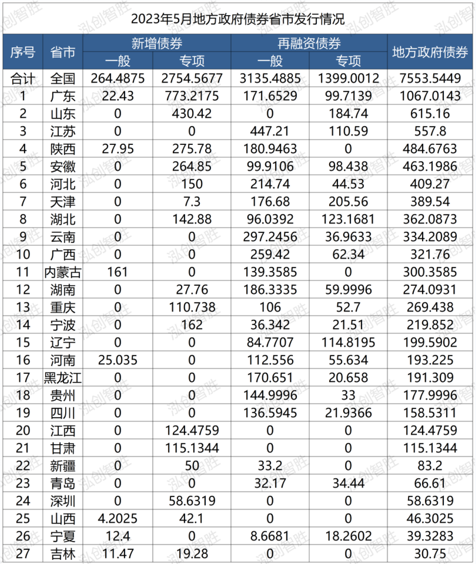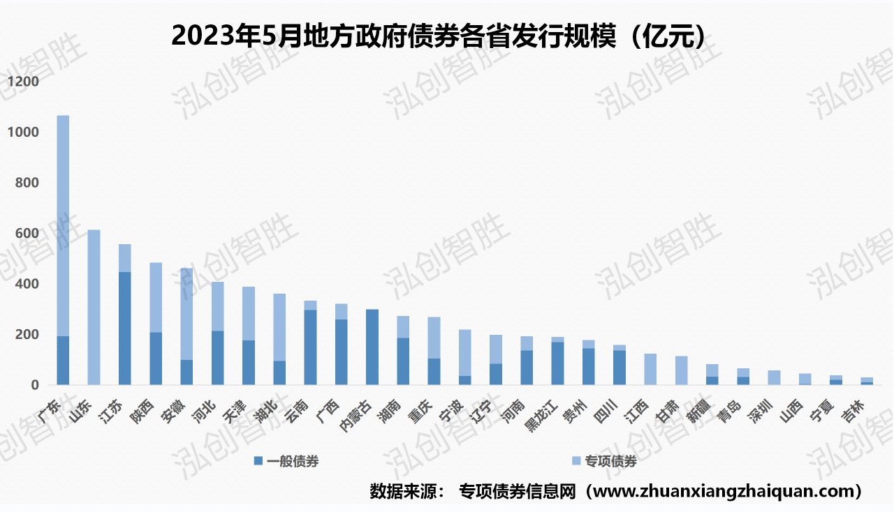 从发行地区来看,5月共计27个地区发行地方政府债券,发行规模前三的省市分别为广东1067.01亿元、山东615.16亿元、江苏557.8亿元。新增专项债券发行规模前三的省市分别为广东773.22亿元、山东430.42亿元、陕西275.78亿元。