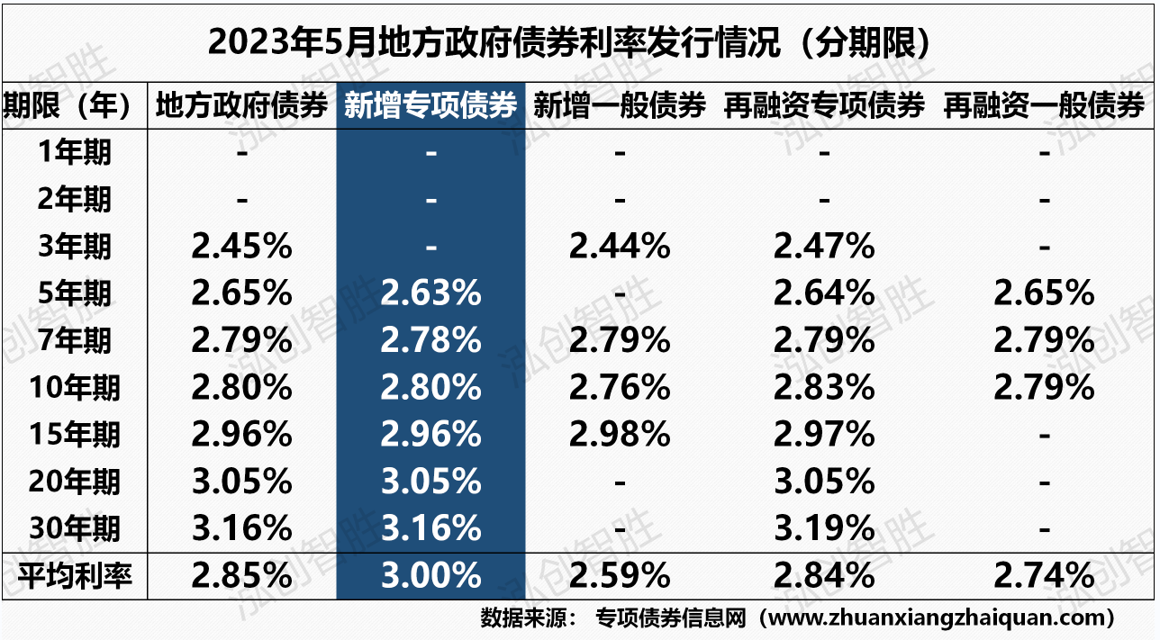 从发行利率来看,5月全国已发行地方政府债券平均利率2.85%,较4月发行平均利率有所下降,其中新增专项债券平均利率为3.00%,低于4月新增专项债券平均利率3.09%。