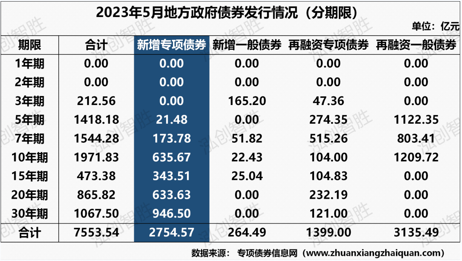 2023年4月,地方政府债券共计发行6728.49亿元,新增债券发行2825.41亿元(专项债券2647.59亿元,一般债券177.82亿元),再融资债券发行3903.08亿元(专项债券1423.11亿元,一般债券2479.98亿元)。2023年4月,地方政府债券平均发行期限13.05年,其中一般债券8.46年,专项债券16.05年。2023年4月,地方政府债券平均发行利率3.00%,其中一般债券2.89%,专项债券3.06%。从5月发行规模来看,地方政府债券共计发行7553.54亿元,环比上升10.92%。其中,新增专项债券发行3019.06亿元(专项债券2754.57亿元,一般债券264.49亿元),再融资债券发行4534.49亿元(专项债券1399.00亿元,一般债券3135.49亿元)。5月地方政府债券发行以再融资债券为主,再融资债券占5月地方政府债券发行额的比例达60.03%。再融资债券发行以再融资一般债券为主,再融资一般债券占5月再融资债券发行规模的69.15%。5月新增债券发行以新增专项债券为主,占5月新增债券发行规模的91.24%。