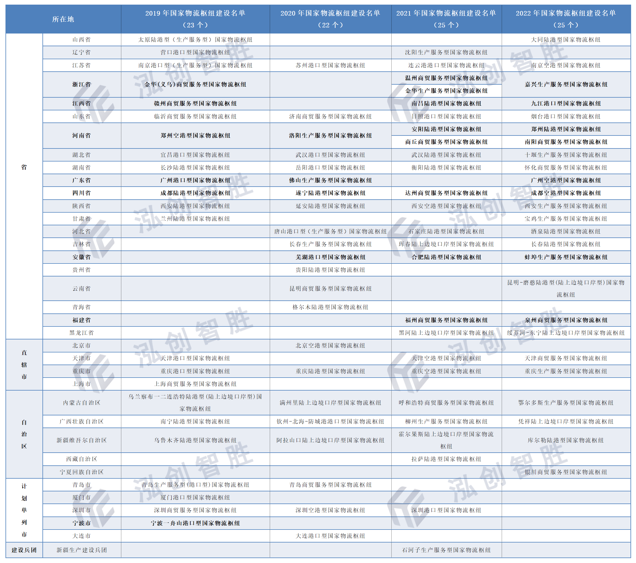 2018年12月,国家发展改革委和交通运输部联合发布《国家物流枢纽布局和建设规划》(发改经贸〔2018〕1886号),在全国选取127个具备一定条件的城市,布局建设212个国家物流枢纽。自2019年以来,国家发改委已牵头发布四批次国家物流枢纽建设名单,枢纽网络覆盖全国30个省(区、市)和新疆生产建设兵团,国家物流枢纽的布局和建设,旨在提升物流总体运行效率、形成示范效应,国家物流枢纽的建设和发展也将带动形成一批以物流业为主的产业集群,为加快建设“通道+枢纽+网络”的现代物流运行体系,支撑构建新发展格局奠定了坚实基础。国家物流枢纽是由国家发展改革委员会、交通运输部共同布局建设,集中实现货物集散、存储、分拨、转运等多种功能的物流设施群和物流活动组织中心。