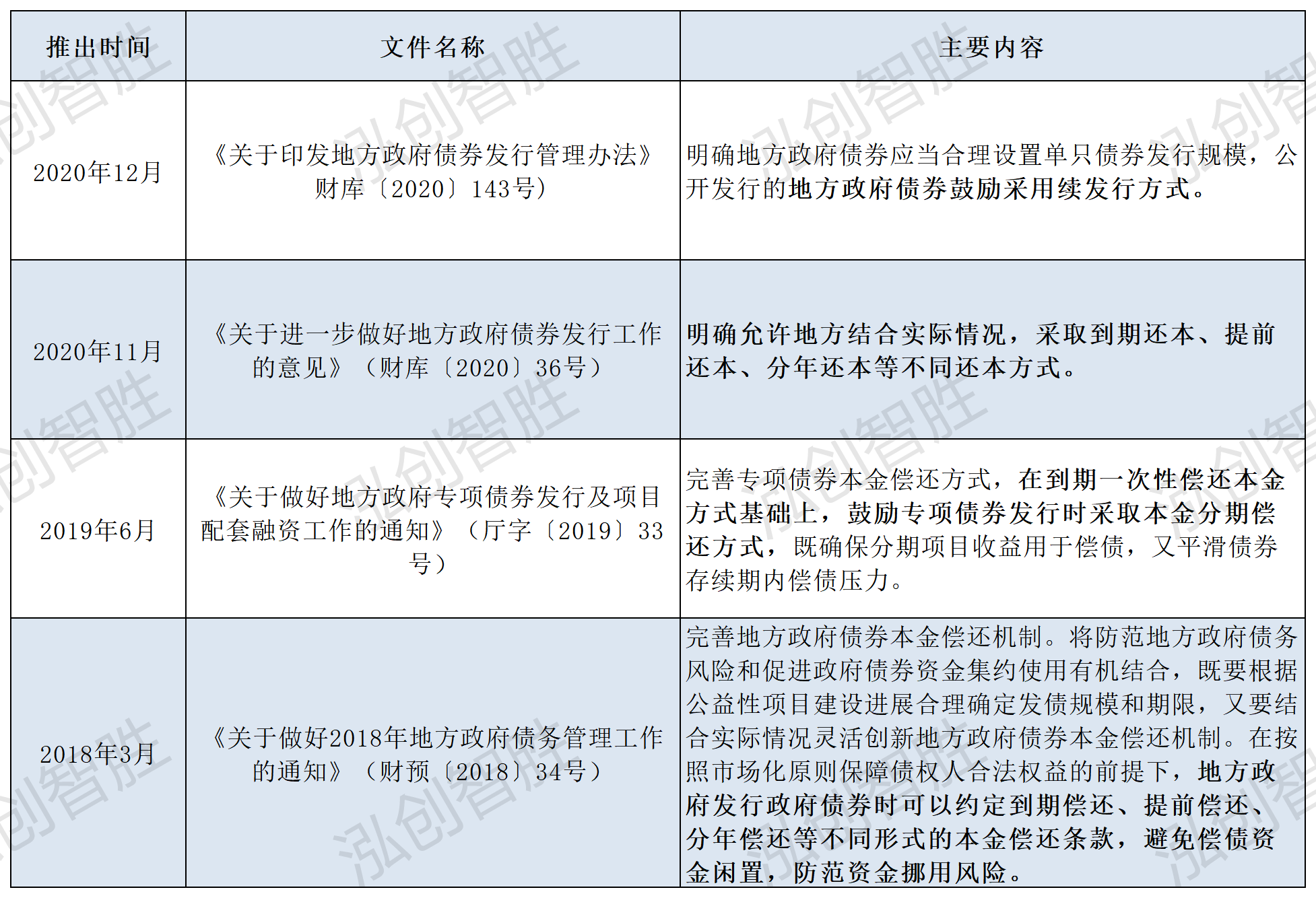 新增专项债券是落实积极财政政策的重要抓手,其发行规模和用途需经过严格审核,保证其完全符合新增专项债券的发行条件。新增专项债券的发行有助于地方政府筹集资金,并将资金投入基础设施建设等各类重要项目,从而达到促投资、稳经济的作用。目前我国随着新增专项债规模不断扩大并逐渐进入还本期,债券集中偿还压力开始显现。为了保障债务能够按约定时间到期偿还,各地政府通常会规定还本方式。在提出还本方式的时候,各地政府通常会综合考虑市场需求、政府财力、项目情况等因素来做出决策。目前,全国新增专项债券还本方式主要有以下几种:(1)分年还本:债券到期之前,采用分期偿还的方式进行还款。将债券本金及到期利息分摊在不同的年份中分期还清。(2)到期一次性还本:债券到期后,一次性偿还本金。(3)提前还本(含权债券)¹:债务人可选择行使提前赎回选择权,提前进行还本,也可不行使权力,到期还本。(4)续发还本:在原有专项债券到期后,发行新的专项债券来偿还原有专项债券的方式;即政府发行新的专项债券来筹集资金,用于偿还到期的旧专项债券本金。表 1 2018年—2022年关于还本方式的主要政策文件