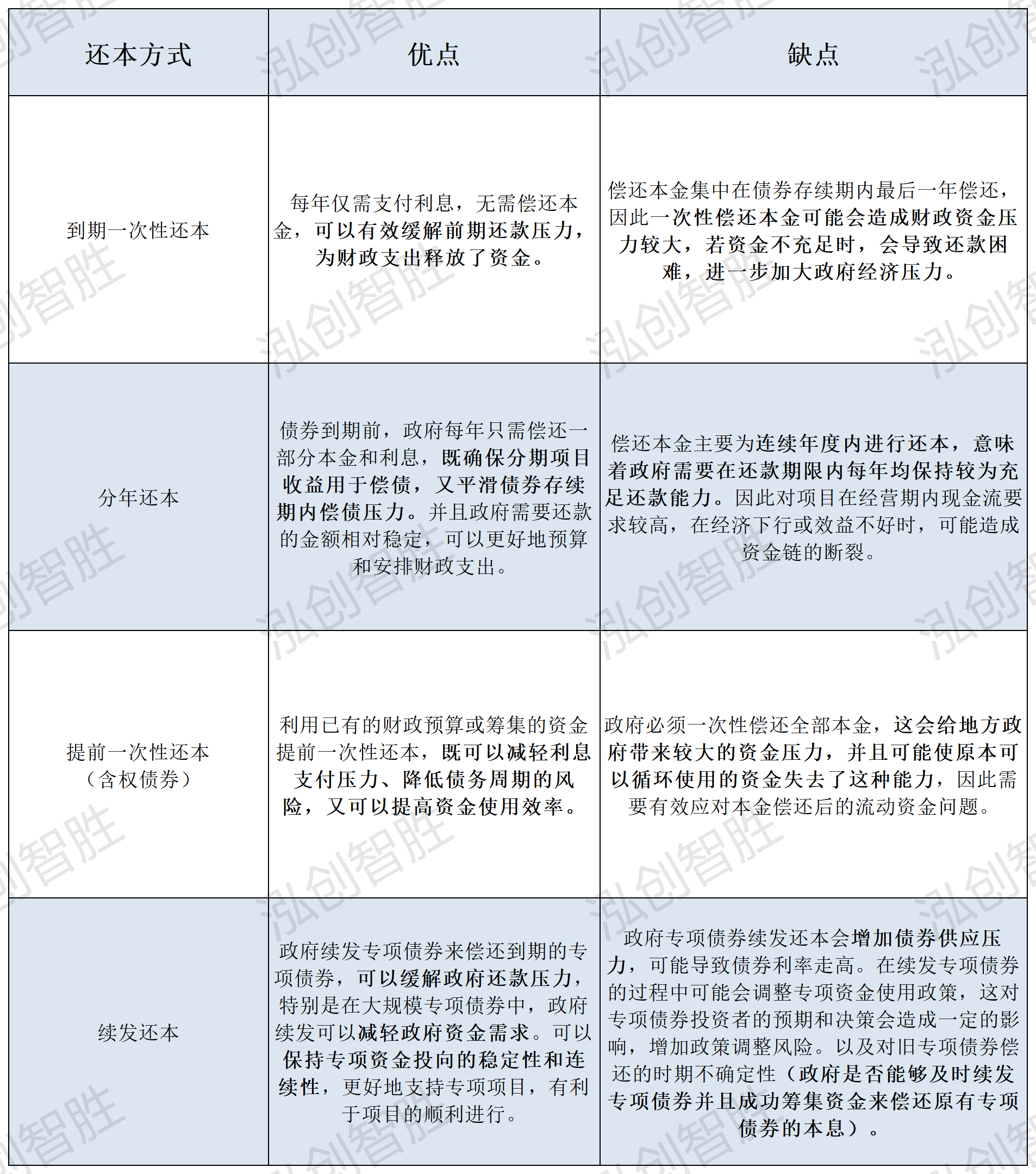 作为一种政府融资方式,新增专项债券已经成为了国家基建项目建设中最为普遍的债务工具之一。但是,如果新增专项债券不能及时偿还,就会导致“债台高筑”,最终引发债务危机,尤其是当经济出现下行压力时,还债难度会加大。因此,需要提前制定还本计划,通过分年还本、到期一次性还本、提前还本(含权债券)、续发还本等方式降低偿债危机。此外,不同种类的债券还本方式也存在差异,每一种还本方式都有自己的优缺点:表 2 还本方式的优缺点整理