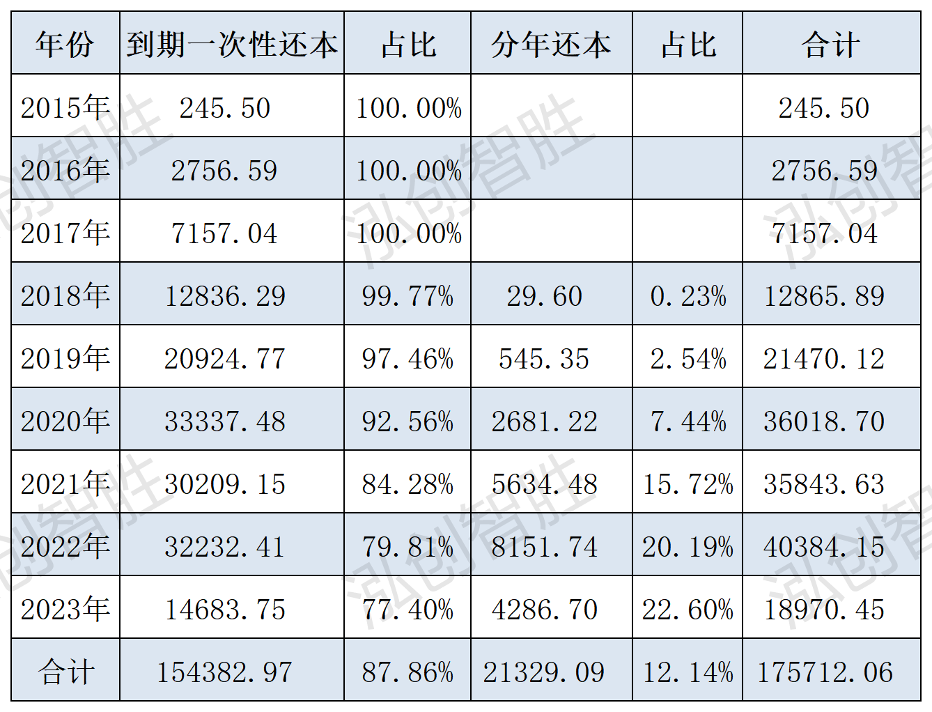 从2015年6月至2023年5月底,根据中国债券信息网所披露信息统计,目前新增专项债券还本方式应用最广泛的是到期一次性偿还本金的方式。这种方式的特点是每年仅需支付利息,不需偿还本金,前期还款压力较小,资金利用率高。2018年首次出现部分地方也会采用分年度支付一定比例本息的方式进行还本,近年发行规模呈上升趋势,但相比较于到期一次性还本,分年还本方式较少使用。表 3 2015年—2023年5月全国还本方式及其发行情况 (单位:亿元)