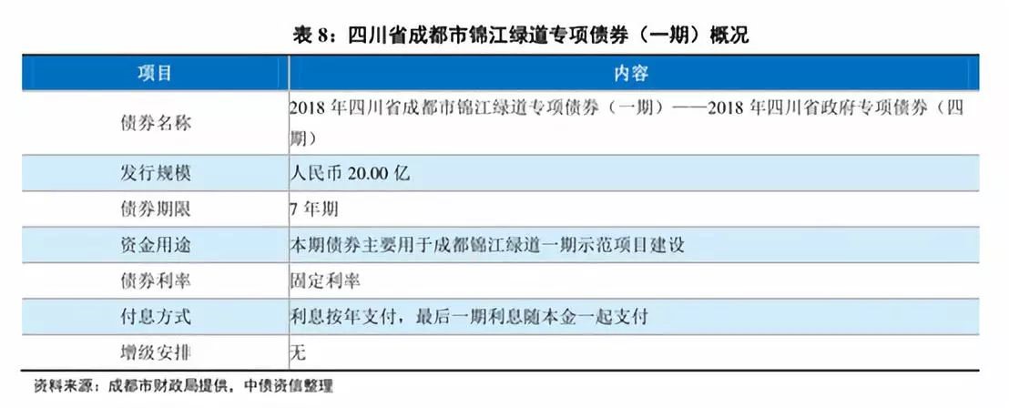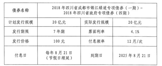 2018年四川省成都市锦江绿道专项债券(一期)-2018年四川省政府专项债券(四期)通过招标方式发行。本期发行额为20亿元,期限为7年,年利率为4.1%,主要用于成都锦江绿道一期示范项目建设。
