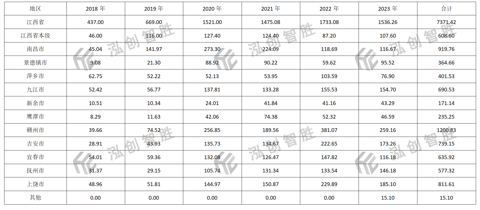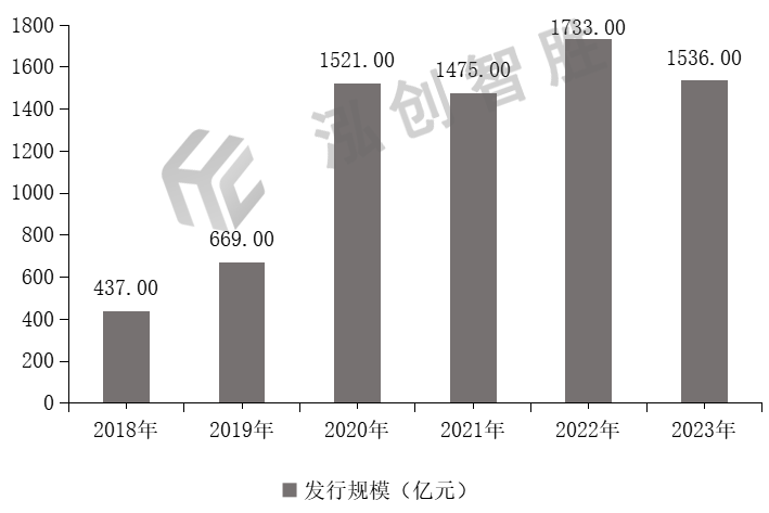 江西省新增专项债券发行规模整体呈现波动增长趋势。2018—2023年分别发行新增专项债券437.00亿元、669.00亿元、1521.00亿元、1475.00亿元、1733.08亿元、1536.00亿元,合计7371.00亿元,年均复合增长率为28.58%。江西省2018—2023年新增专项债券发行情况