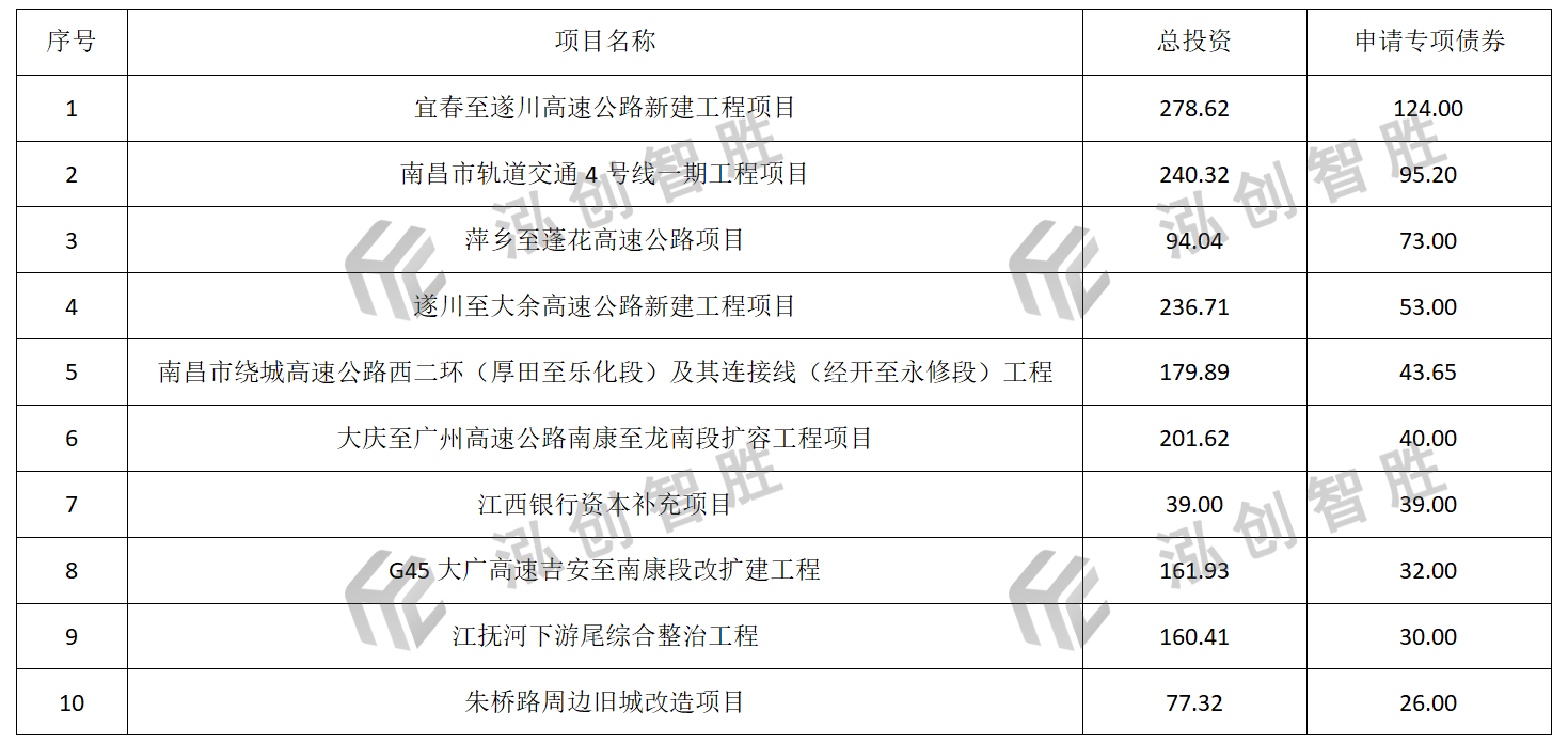 江西省2018—2023年新增专项债券申请规模前十清单项目清单