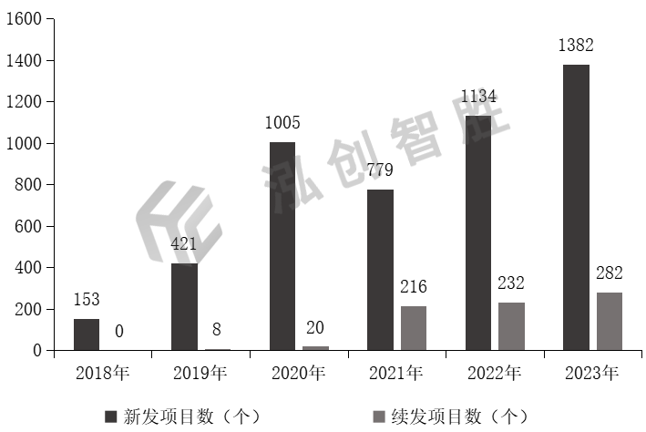 2018—2023年江西省共发行4874个项目,每年分别发行153个、429个、1025个、995个、1366个、1664个,其中新发项目分别为153个、421个、1005个、779个、1134个、1382个,新发项目占比分别为100.00%、98.14%、98.05%、78.29%、83.02%、83.05%。江西省2018—2023年新增专项债券新老项目发行情况