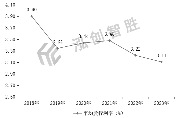 2018—2023年江西省新增专项债券平均发行利率为3.90%、3.34%、3.44%、3.48%、3.22%、3.11%,整体呈现波动下降趋势。江西省2018—2023年新增专项债券平均发行利率情况
