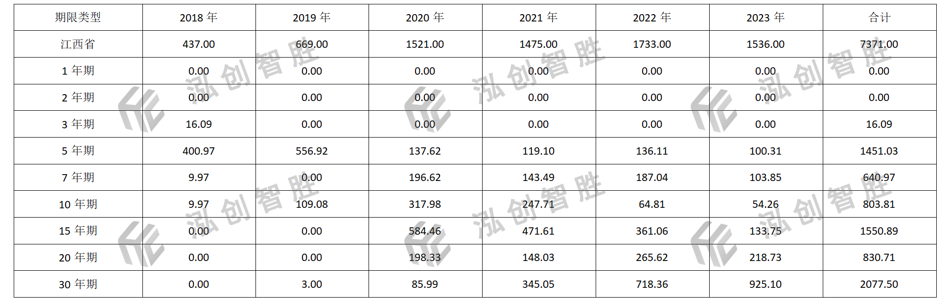 数据来源:专项债券信息网(www.zhuanxiangzhaiquan.com)江西省新增专项债券共涉及3年期、5年期、7年期、10年期、15年期、20年期、30年期七种期限类型。江西省六年新增专项债券发行期限主要以15年期、30年期为主,15年期和30年期的六年累计发行规模3628.39亿元,占江西省总发行规模的比例分别为21.04%、28.18%。含权期限方面,江西省2018—2023年未发行过含权期限债券。江西省2018—2023年新增专项债券期限发行情况