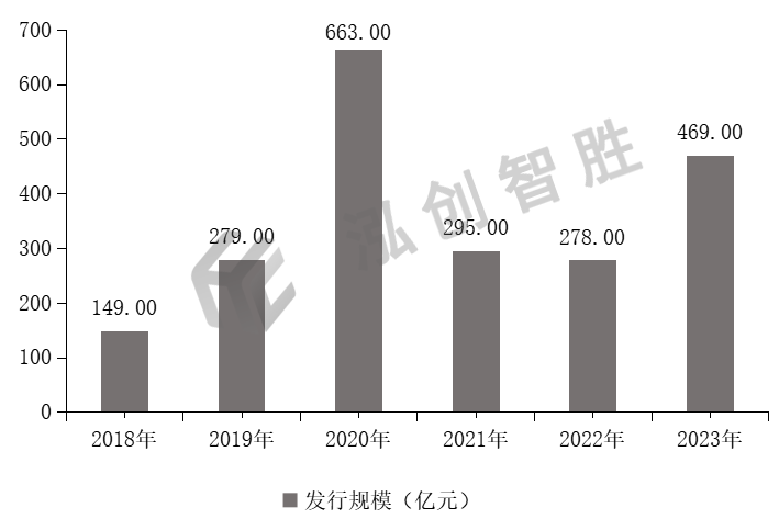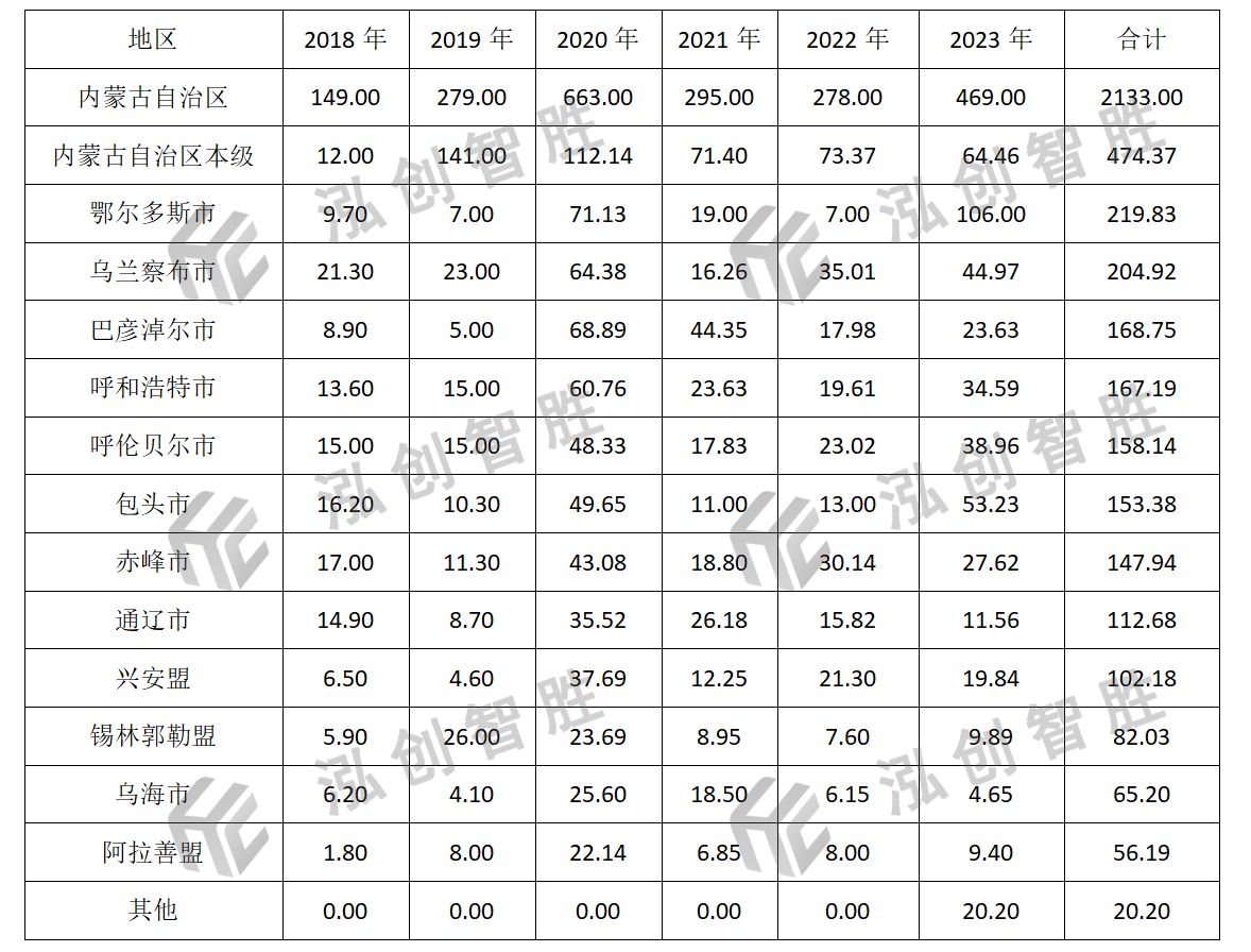 内蒙古自治区2018—2022年新增专项债券发行规模呈现上升后下降趋势,2023年发行规模又开始小幅上升,2020年发行规模激增主要是受到疫情影响,每年发行规模分别为:149.00亿元、279.00亿元、663.00亿元、295.00亿元、278.00亿元、469.00亿元,共2133.00亿元,平均复合增长率为25.78%,内蒙古自治区2023年发行规模占全国2023年发行规模的1.19%,位列第28名。内蒙古自治区2018—2023年新增专项债券发行情况