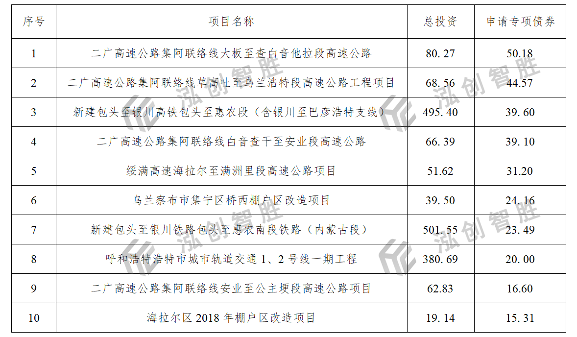 内蒙古自治区2018—2023年新增专项债券申请规模前十清单项目清单