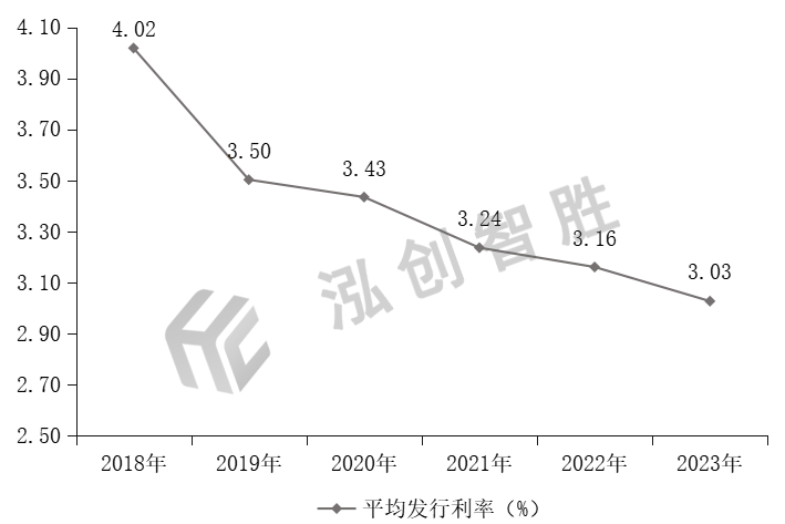 内蒙古自治区2018—2023年新增专项债券每年平均发行利率分别为:4.02%、3.50%、3.43%、3.24%、3.16%、3.03%,呈逐年下降趋势,2023年较2018年平均发行利率下降幅度达到99BP。2018—2019年略高于全国平均水平,2020—2021年均低于全国平均水平。内蒙古自治区2018—2023年新增专项债券平均发行利率情况