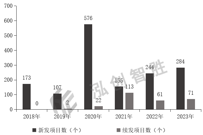 内蒙古自治区2018—2023年共发行1808个项目,新发项目6年占比分别为100%、98.17%、96.32%、57.84%、80.00%、80.00%,每年新发项目明显多于续发项目,说明内蒙古自治区每年新增专项债券项目储备较足,同时建议重点关注未安排续发的在建项目。内蒙古自治区2018—2023年新增专项债券新老项目发行情况
