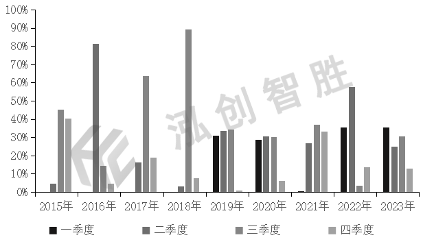 在国内经济下行压力以及稳增长诉求下,地方政府债券尤其是专项债券作为积极财政政策的重要着力点,政策频出,被多次强调“早发行、早使用”,作为基建投资的资金来源之一,专项债是近年来补短板、调结构、稳投资的重要发力点。2018年以前,新增专项债券发行主要集中在下半年,全国层面一般要求在当年9—11月发完。2018年8月,财政部下发《关于做好地方政府专项债券发行工作的意见》(财库〔2018〕72号),通知称,今年地方政府债券发行进度不受季度均衡要求限制,各地至9月底累计完成新增专项债券发行比例原则上不得低于80%,剩余的发行额度应当主要放在10月份发行。2019年4月,财政部下发《财政部关于做好地方政府债券发行工作的意见》(财库〔2019〕23号),通知称,2019年6月底前完成提前下达新增债券额度的发行,争取在9月底前完成全年新增债券发行。9月国常会表示,今年限额内地方政府专项债券要确保9月底前全部发行完毕,10月底前全部拨付到项目上,督促各地尽快形成实物工作量。2020年7月,财政部下发《关于加快地方政府专项债券发行使用有关工作的通知》(财预〔2020〕94 号),通知要求,对近期下达及后续拟下达的新增专项债券,与抗疫特别国债、一般债券统筹把握发行节奏,妥善做好稳投资稳增长和维护债券市场稳定工作,确保专项债券有序稳妥发行,力争在10月底前发行完毕。2021年10月,财政部预算司副司长李大伟在财政部发布会上表示,下一步,财政部将继续加强对地方的指导,要求地方按照“资金跟着项目走”的原则,继续围绕国家重大区域发展战略以及“十四五”发展规划等,加大对重点项目的支持力度,2021年新增专项债券额度尽量在11月底前发行完毕。2022年3月,国务院常务会议要求去年提前下达的额度5月底前发行完毕,今年下达的额度9月底前发行完毕。5月《国务院印发扎实稳住经济一揽子政策措施的通知》(国发〔2022〕12号),通知要求,抓紧完成今年专项债券发行使用任务,加快今年已下达的3.45万亿元专项债券发行使用进度,在6月底前基本发行完毕,力争在8月底前基本使用完毕。政策引导下,新增专项债券发行进度总体前置,2022年上半年累计已发行新增专项债券34062.17亿元,完成3.65万亿元限额的93.32%,远高于以前年份同期发行进度,也是首次在上半年就基本完成了新增专项债券发行工作,10月在5000多亿元专项债券地方结存限额政策助力下,再次迎来新增专项债券发行小高峰。2023年8月底,财政部部长刘昆在全国人大常委会会议作《国务院关于今年以来预算执行情况的报告》时表示,加力提效实施好积极的财政政策,今年新增专项债券力争在9月底前基本发行完毕,用于项目建设的专项债券资金力争在10月底前使用完毕。图 3 2015—2023年新增专项债券季度发行进度情况