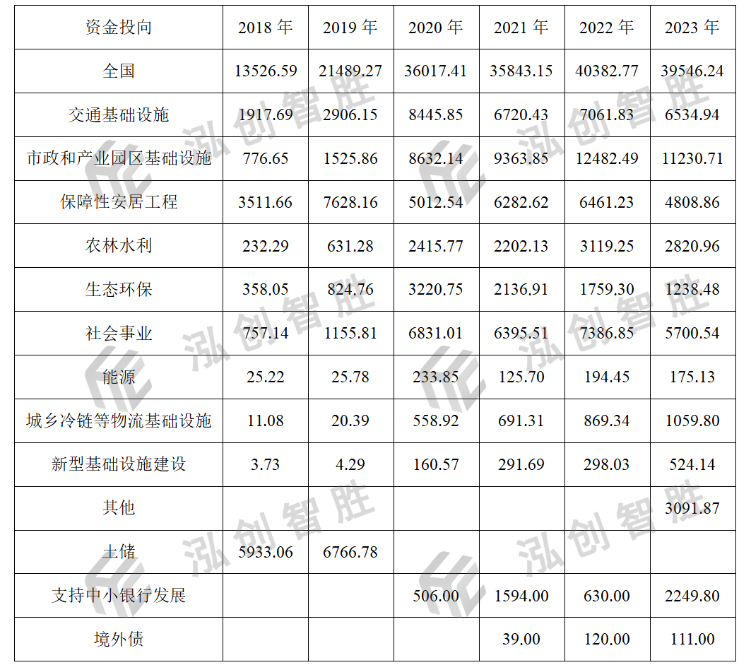 2017年5月16日,《地方政府土地储备专项债券管理办法(试行)》(财预〔2017〕62号)印发。2017年6月2日,《关于试点发展项目收益与融资自求平衡的地方政府专项债券品种的通知》(财预〔2017〕89号)印发。2017年7月13日,《地方政府收费公路专项债券管理办法(试行)》(财预〔2017〕97号)印发。2018年3月1日,《试点发行地方政府棚户区改造专项债券管理办法》(财预〔2018〕28号)印发,进一步扩大了专项债券投向领域。2019年9月,国务院常务会确定,根据地方重大项目建设需要,按规定提前下达明年专项债部分新增额度,确保明年初即可使用见效,并扩大使用范围,重点用于铁路、轨道交通、城市停车场等交通基础设施,城乡电网、天然气管网和储气设施等能源项目,农林水利,城镇污水垃圾处理等生态环保项目,职业教育和托幼、医疗、养老等民生服务,冷链物流设施,水电气热等市政和产业园区基础设施。专项债资金不得用于土地储备和房地产相关领域、置换债务以及可完全商业化运作的产业项目。这是国家首次公布地方政府专项债券负面清单,同时构建了专项债券投向领域的基础分类框架,形成初步的专项债券七大领域。2020年7月财政部下发《关于加快地方政府专项债券发行使用有关工作的通知》(财预〔2020〕94 号),通知要求,新增专项债券资金投向重点用于国务院常务会议确定的交通基础设施、能源项目、农林水利、生态环保项目、民生服务、冷链物流设施、市政和产业园区基础设施等七大领域。2021年2月,财政部、发改委联合下发《关于梳理2021年新增专项债券项目资金需求的通知》提出,2021年新增专项债券重点用于交通基础设施、能源项目、农林水利、生态环保项目、社会事业、城乡冷链物流设施、市政和产业园区基础设施、国家重大战略项目、保障性安居工程等九大领域。2022年4月国务院召开了加快政府债券发行使用情况国务院政策例行吹风会,会议提出,除继续用于9大领域外,合理扩大使用范围,主要包括三个方面:一是加大惠民生、解民忧等领域投资。指导地方将城市管网建设、水利等重点领域项目作为补报重点。二是支持增后劲、上水平项目建设。主要是围绕新基建等加大支持力度,研究将具有公益性且有一定收益的信息基础设施、融合基础设施、创新基础设施作为支持重点。三是推动补短板、强弱项项目建设。要求各地围绕全面推进乡村振兴、加快农业农村现代化,做好农业农村领域项目储备,将粮食仓储物流设施作为专项债券支持重点,支持重要农产品特别是粮食供给,保障国家粮食安全。2022年10月下达的组织申报2023年地方政府专项债券项的通知里,明确申报项目必须符合投向领域有关规定。严格执行《国家发展改革委关于盘活地方政府专项债务限额存量做好专项债券项目有关工作的通知》(发改投资(2022)1440号)明确的专项债券投向领域、可用作项目资本金的行业以及专项债券投向领域禁止类项目清单。即在原有9大领域投向基础上新增新能源(并入能源领域)和新基建投向。2023年9月,两部委对专项债券投向领域、可用作项目资本金的行业范围等作了修订,专项债投向将增加至十一大领域,新增特殊重大项目领域大类。同时,保障性安居工程领域大类中新增城中村改造、保障性住房两个细分投向,此分类将有助于加快推进城中村改造和保障性住房建设项目建设,改善人民群众的居住条件。除此之外,2020年7月国务院常务会决定,在今年新增地方政府专项债限额中安排一定额度,允许地方政府依法依规通过认购可转换债券等方式,探索合理补充中小银行资本金的新途径。2020年10月《深圳建设中国特色社会主义先行示范区综合改革试点首批授权事项清单》确定,先行先试地方政府债券发行机制:授权深圳在国家核定地方债额度内自主发行。创新地方政府举债机制,允许深圳到境外发行离岸人民币地方政府债券。自此,除原有支持投向领域外,新增专项债券还可用于支持中小银行发展和离岸人民币地方政府债券。关于新增专项债券投向领域的相关政策每年调整,同时对于各个投向领域的侧重点也在不断调整。2018年、2019年新增专项债券资金主要用于土储和棚改项目,两项发行规模合计占比均超过65%。2020—2023年新增专项债券资金主要投向基础设施建设,其中投向市政和产业园区基础设施领域的资金最多,4年累计发行达11230.71亿元,占4年总发行规模的27.48%,且发行规模不断扩大、单年发行占比不断提高,到2023年该占比高达28.40%;其次是投向交通基础设施,4年累计发行28763.06亿元,占4年总发行规模的18.95%,其发行规模和单年发行占比整体呈下降趋势;4年累计投向社会事业、保障性安居工程占比分别为17.34%、14.87%。2023年10月开始,部分省份在发行债券时,未披露项目清单、一案两书等信息,无法确定各项目的所属区划、领域及发行金额,本文对这部分项目所属区划和领域暂归为其他。此类项目累计发行规模为3091.87亿元,占2023年已发行规模的7.82%。表 2 2018—2023年新增专项债券资金投向发行情况单位:亿元