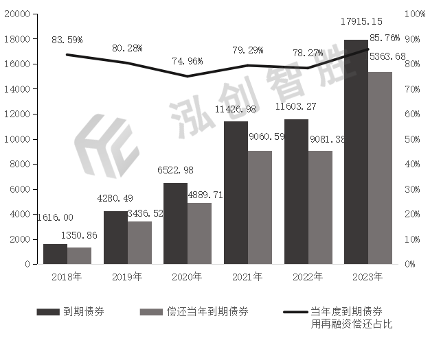 数据来源:专项债券信息网(www.zhuanxiangzhaiquan.com)2018—2023年80%左右的到期专项债券本金以再融资专项债券进行偿还。当地方财政减收遇上到期偿债高峰,预计2024年再融资发行也会有一个发行高峰期。按到期新增专项债券的80%都用再融资专项债券进行偿还计算,2024年再融资专项债券发行规模超过1万亿元,需要注意的是,此处再融资专项债券未包括可能用来偿还存量债券的规模,在各地财政负担加重、债务化解压力下,未来也不排除仍会继续发行再融资债券用于偿还存量债务的可能,届时,再融资专项债券发行规模和占地方政府债券发行比例或将进一步上升。图 9 2018—2023年专项债券到期用再融资偿还情况
