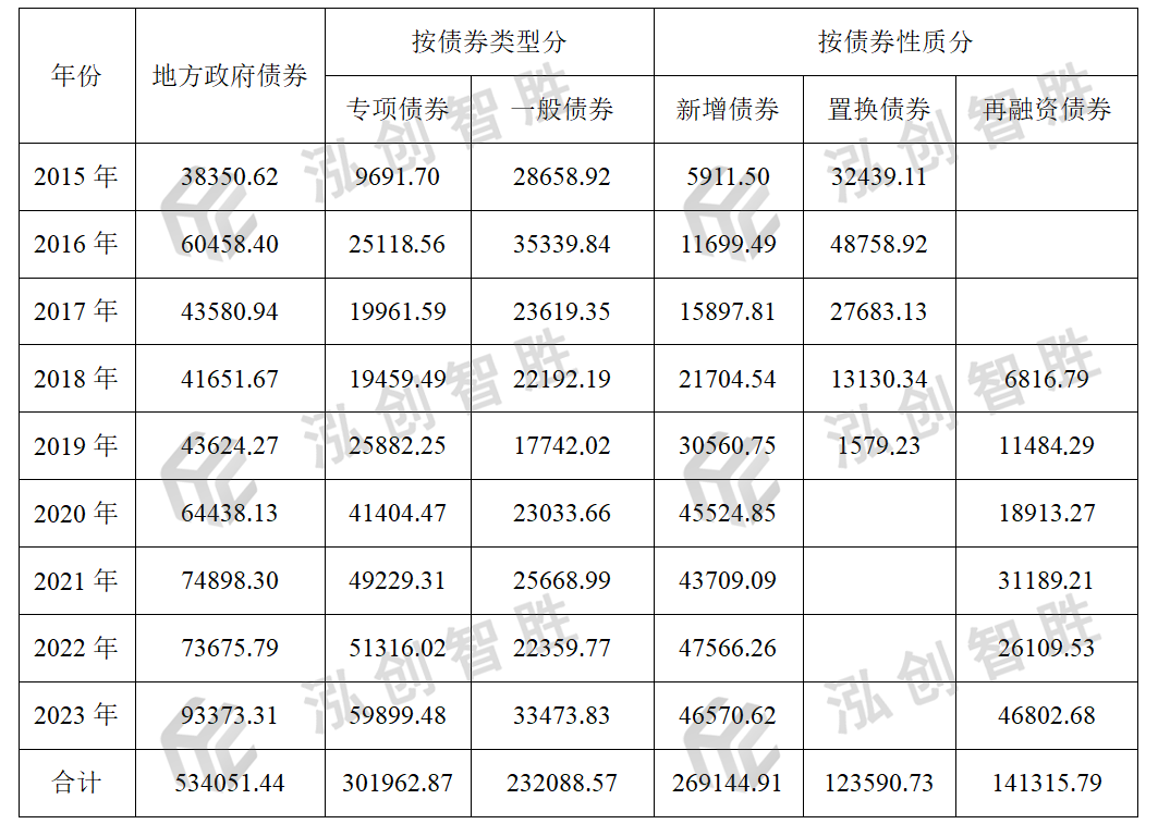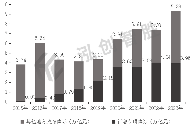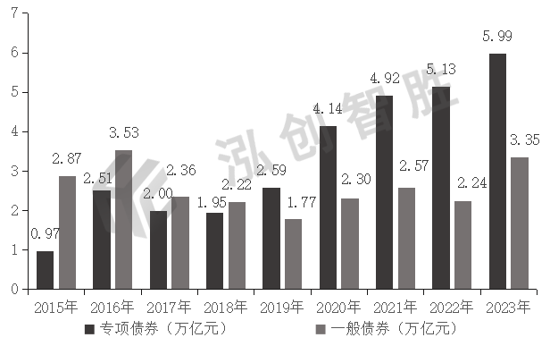2015—2023年,全国地方政府债券已累计发行53.41万亿元,其中一般债券23.21万亿元,专项债券30.20万亿元。自2019年以来,专项债券发行规模逐渐超过一般债券,且差额越来越大,到2023年专项债券发行规模已经是一般债券的2倍左右。