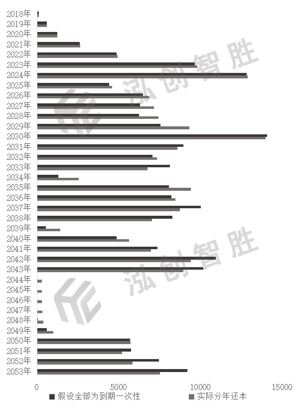 随着新增专项债券第一波偿债高峰期的到来,地方政府集中偿债压力加大。图10将已发行新增专项债券按实际的含分年还本计算到期本金和假设全部按到期一次性还本计算到期本金做比较。可以发现,除前面几年因尚未开始或仅少数省市开始尝试分年还本且期限较短导致集中偿债,2027年以后年份,虽然也会有部分偿债高峰期重合,但分年还本仍是在一定程度上,减轻了本金一次性偿还的压力,平滑了债券存续期内偿债压力。值得一提的是此处仅计算了到期本金,若加上对应分年还本利息,除了减轻集中偿付压力外,分年还本方式还能节约一部分利息支出。结合前面分析的分年偿还比例在不断地上升,预计未来分年偿还或会成为还本新趋势。确定专项债券还本方式时统筹考虑多方因素,因地制宜,根据项目的收益与特点,设计、选择适宜的还本方式,既要使项目营运更加稳定有序,又要使偿债风险尽可能地降低,进一步推进地方政府专项债券的发展。图 10 2018—2053年新增专项债券到期情况