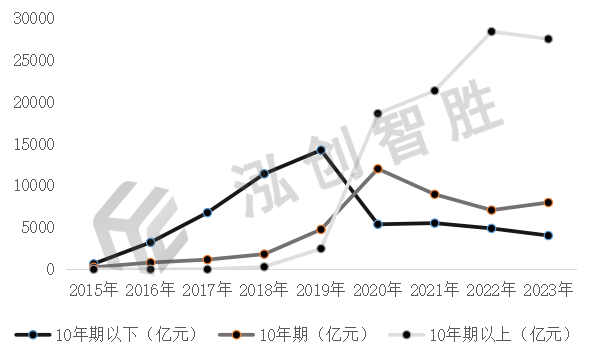 数据来源:专项债券信息网(www.zhuanxiangzhaiquan.com)近年来,我国不断完善地方政府债券期限结构管理,2019年,财政部不再限制地方政府债券期限比例结构,2020年10年期及以上地方政府债券发行规模占比大幅上升。2020年11月确定地方政府债券期限为1年、2年、3年、5年、7年、10年、15年、20年、30年。同时提出应当保障专项债券期限与项目期限相匹配。同时,从图5可以看到,以2020年为分水岭,早期土储专项债券等期限相对较短,2020年我国结合国家战略和规划不断优化调整债券投向,从政策和规则上强调合理提高长期专项债券期限比例,发行期限逐渐往长期限倾斜。从新增专项债券发行情况来看,10年期及以上发行规模占比从2018年的15.63%到2019年的33.69%,再到近四年的85%以上,2023年新增专项债券长期限发行规模占比已经高达89.79%。图 5 2015—2022年新增专项债券期限发行情况