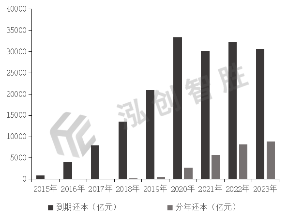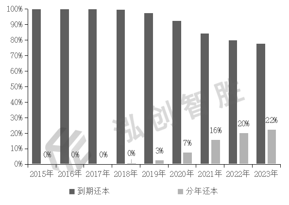 2018年9月,深圳披露2018年第一批新增专项债券发行资料,涉及6只债券发行,其中4只新增专项债券采用本金分年偿还方式,由此拉开新增专项债券分年还本序幕。2020年11月财政部发布《关于进一步做好地方政府债券发行工作的意见》,意见中指出,地方财政部门应当统筹考虑地方债收益率曲线建设、项目期限、融资成本、到期债务分布、投资者需求等因素科学设计债券期限。允许地方结合实际情况,采取到期还本、提前还本、分年还本等不同还本方式。到期还本和分年还本是目前地方政府专项债市场比较常见的还本方式。提前一次性还本一般为含权债券,债务人可选择行使提前赎回选择权,提前进行还本,也可不行使权力,到期还本。提前还本方式在资金充足的情况下,可提前进行本金偿还,既减轻了利息支付的压力,又提高了资金的使用效率。2015—2023年,共有30个发行主体累计发行25918.10亿元分年还本新增专项债券,占新增专项债券总发行规模的12.98%。其中,河北、吉林、深圳、湖北、辽宁、广西、河南等省分年还本发行规模占比最高,占本省新增专项债券总发行规模比重依次为64.73%、56.36%、53.32%、48.35%、44.11%、38.84%、35.83%。图 6 2015—2023年新增专项债券还本方式情况