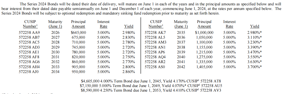马歇尔县(英语:Marshall County)是美国田纳西州中南部的一个县。面积974平方公里。根据美国2000年人口普查,共有人口26767人。县治刘易斯堡(Lewisburg)。马歇尔县成立于1839年1月19日。县名纪念曾任代表维吉尼亚州的众议员、国务卿、首席大法官的约翰·马歇尔。该债券将以完全注册的形式发行,发行后将以Cede&Co.作为债券的名义持有人。债券自2024年1月29日开始发行,共发行$36,970,000(详见表1)。债券从2024年1月29日开始支付利息,并在之后每半年支付一次利息,即每年的6月1日和12月1日付息,直至到期或提前赎回为止。该债券购买以5000美元起,购买价格为5000美元或其任何整数倍。标准普尔全球评级公司(STANDARD&POOR)根据保险人签发的保单,给出“AA”评级;根据该县提供的文件和其他信息给出“A-”评级。(详见表2)表1债券分期发行情况表(美元)