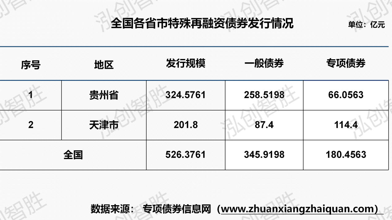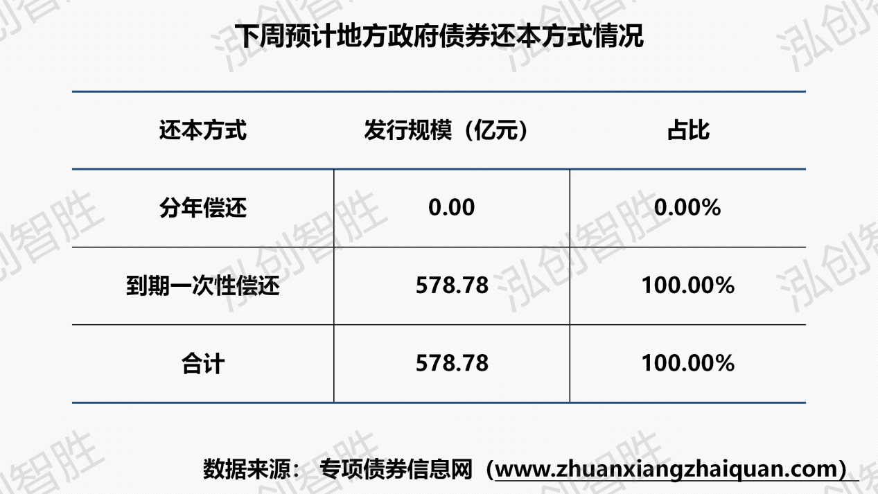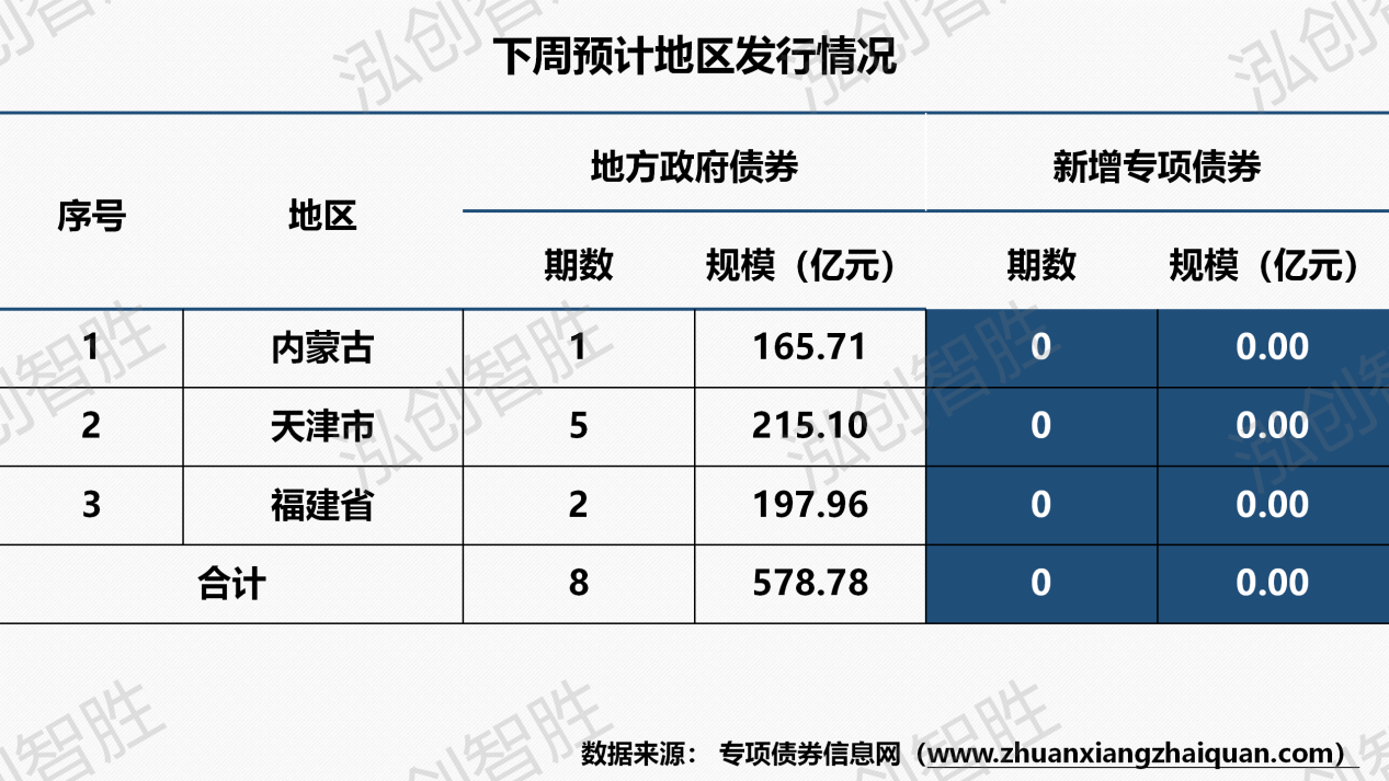 下周地方政府债券预计发行规模579亿元,全部为再融资债券。其中,专项债券326亿元,一般债券253亿元。下周预计共有三个地区(内蒙古、天津、福建)计划发行8期地方政府债券,发行规模579亿元。下周共发行8期地方政府债券,发行规模合计579亿元。还本方式均采取到期一次性还本。