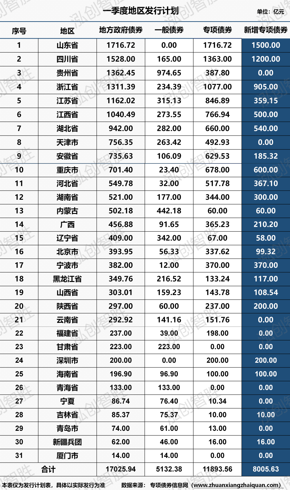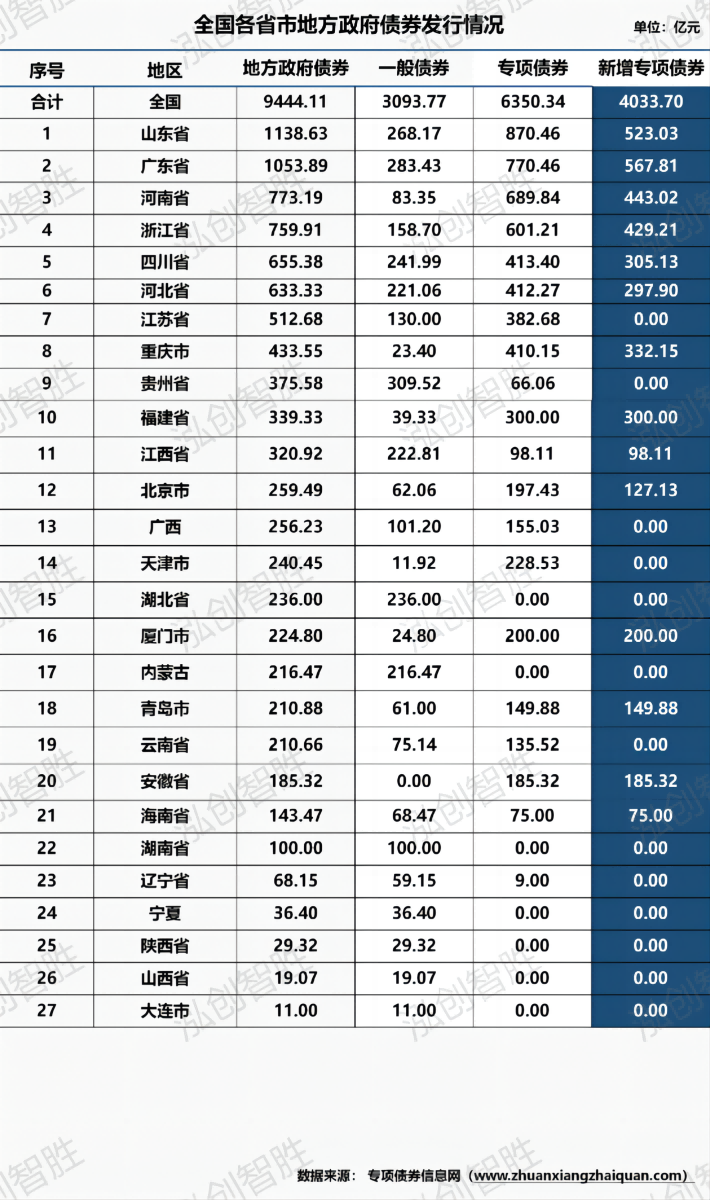 山东、四川计划发行新增专项债券均超千亿元,拟发行规模分别为1500亿元、1200亿元;两个地区累计发行规模占一季度新增专项债券计划发行规模的33.73%。浙江、重庆、江西、湖北计划发行新增专项债券规模在500亿元及以上。