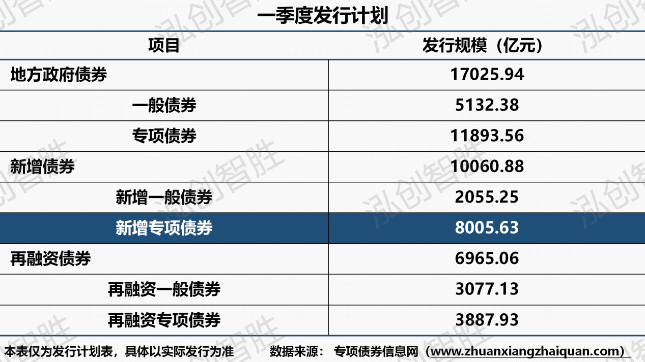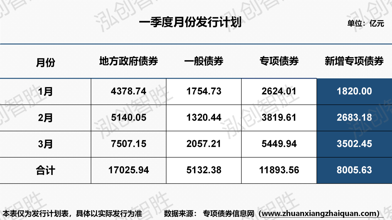 从各月份发行情况来看,一季度地方政府债券和新增专项债券发行规模最大的均为3月份,分别占1季度计划发行规模的43.75%、44.09%。