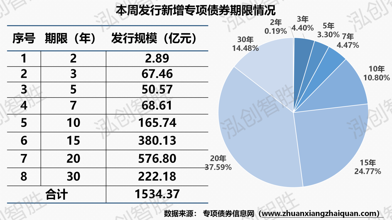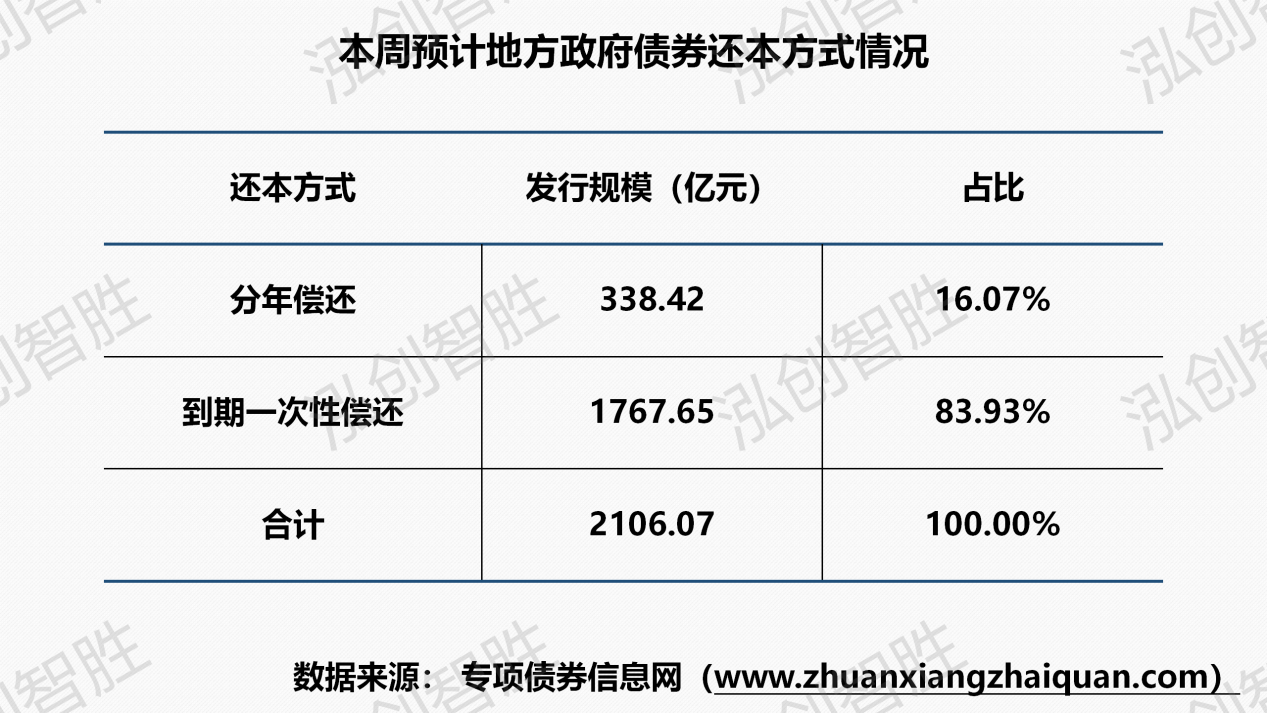 新增债券1628亿元(含1534亿元新增专项债券),再融资债券479亿元。本周共有九个地区(内蒙古、宁夏、福建、河北、陕西、海南、北京、浙江、四川)计划发行44期地方政府债券,发行规模2106亿元。其中,新增专项债券35期,发行规模1534亿元。本周发行地方政府债券平均期限为14.41年,其中新增专项债券平均期限17.27年。本周发行新增专项债券涉及八种期限类型,2年、3年期、5年期、7年期、10年期、15年期、20年期、30年期。其中,2年期发行2.89亿元,占比为0.19%;3年期发行67.46亿元,占比为4.40%;5年期发行50.57亿元,占比为3.30%;7年期发行68.61亿元,占比为4.47%;10年期发行165.74亿元,占比为10.80%;15年期发行380.13亿元,占比为24.77%;20年期发行576.80亿元,占比为37.59%;30年期发行222.18亿元,占比为14.48%。本周共发行44期地方政府债券,发行规模合计2106.07亿元。其中,采取分年还本债券9期,发行规模合计338.42亿元,其他期债券还本方式均采取到期一次性还本。