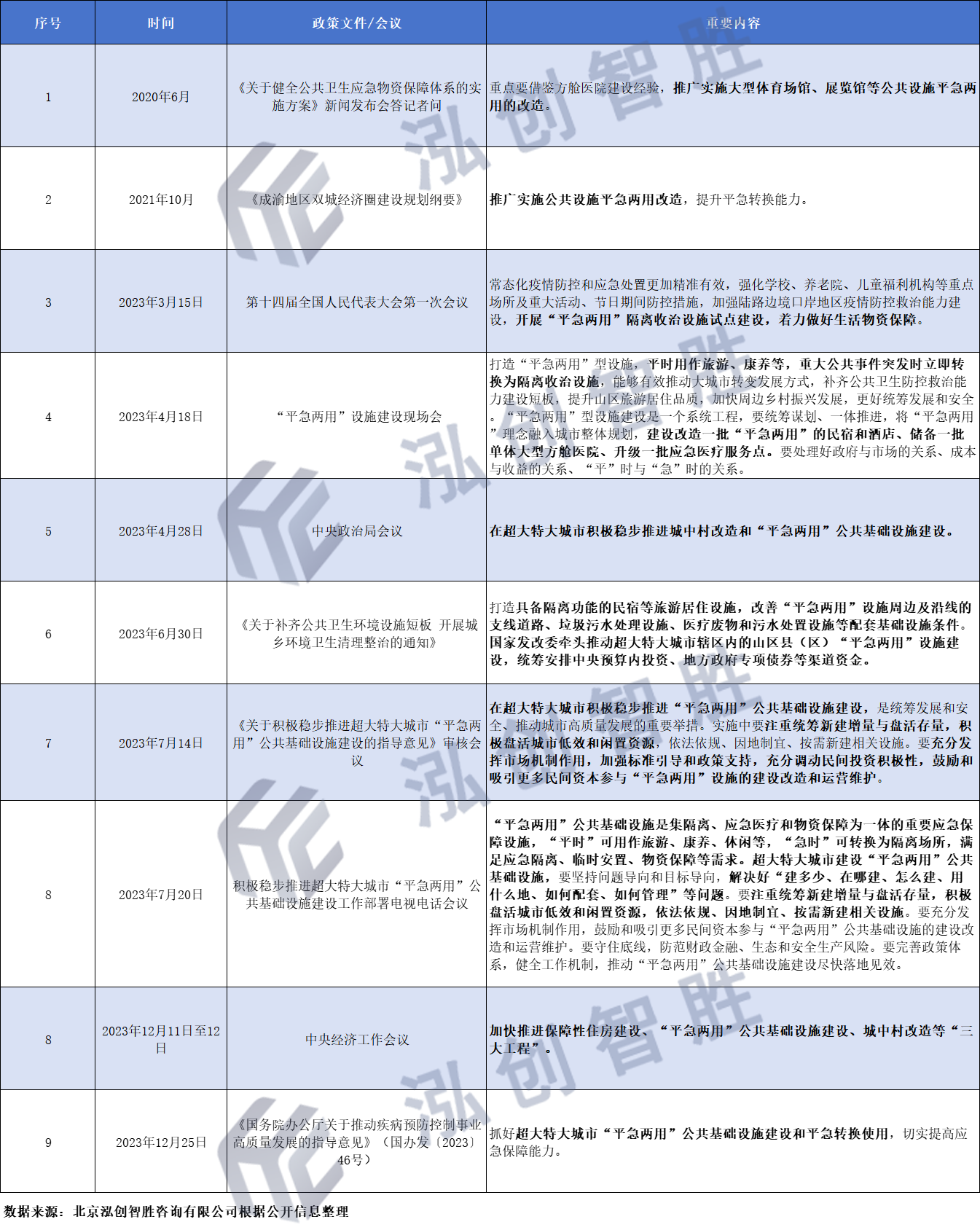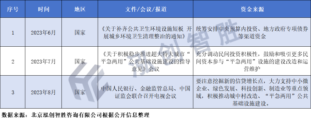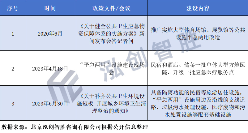 2023年12月,在中央经济工作会议习近平主席讲话中,提及要加快推进保障性住房建设、“平急两用”公共基础设施建设、城中村改造等“三大工程”。在中央经济工作会议之前,“平急两用”公共基础设施建设作为“三大工程”之一,已经多次被提及,但到底什么是“平急两用”?“平急两用”重点建设城市有哪些?建什么?资金哪里来?本文对目前各类政策及相关资料进行简单梳理以供大家参考。结合人民网“平急两用”相关报道及2023年7月20日,积极稳步推进超大特大城市“平急两用”公共基础设施建设工作部署电视电话会议,中共中央政治局委员、国务院副总理何立峰讲话,总结出“平急两用”基本概念。“平急两用”公共基础设施建设是指在公共基础设施建设中,将平时使用和应急使用有机结合,打造一个既具备日常运营功能,又具备应急响应能力的基础设施系统,是集隔离、应急医疗和物资保障为一体的重要应急保障设施,“平时”可用作旅游、康养、休闲等,“急时”可转换为隔离场所,满足应急隔离、临时安置、物资保障等需求。表1 “平急两用”政策脉络