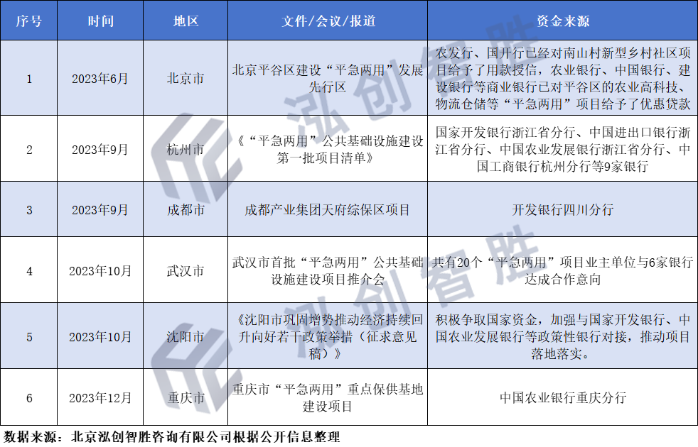 1、北京市平谷区探索“平急两用”设施建设5个应用场景平谷作为首都大京郊重要组成部分,围绕解决“吃、住、行、医和集中承载”问题,明确提出重点打造五个应用场景。(1)围绕“吃”,平谷区打造“平急两用”农副产品保供基地;(3)围绕“行”,打造“平急两用”承平高速金海湖服务区;(5)围绕“集中承载”,打造“平急两用”乡村振兴金海湖核心区。平谷区“平急两用”项目吸引多家银行研究金融创新产品,给予低成本、长周期的金融支持,农发行、国开行已经对南山村新型乡村社区项目给予了用款授信,农业银行、中国银行、建设银行等商业银行已对平谷区的农业高科技、物流仓储等“平急两用”项目给予了优惠贷款。成都天府国际空港综合保税区项目为省、市重点项目,总投资约52.5亿元。成都天府国际空港综合保税区项目其中项目一期为首开区及冷链物流中心,将建成生鲜冷链物流中心和符合GSP标准的医药冷链物流中心,作为“平急两用”城郊大型仓储基地,“平时”服务城市的进口食材和GSP医药仓储中转,“急时”可快速改造为医药类应急物资和肉类应急仓储中转。项目由成都产业集团与开发银行四川分行积极合作,共同推进成都天府国际空港综合保税区成功落地全省首批“平急两用”公共基础设施项目授信,授信金额2.9亿元。