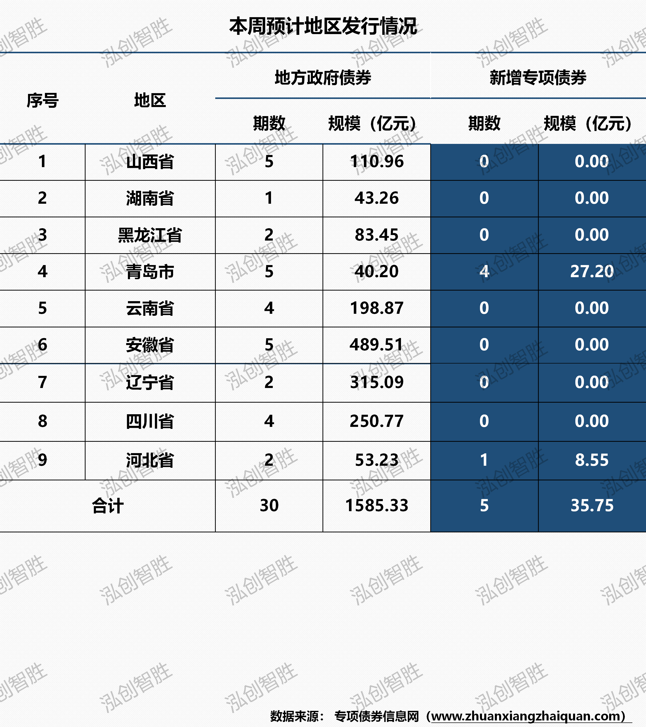 新增债券221亿元(含专项债券36亿元),再融资债券1364亿元。本周共有九个地区(山西、湖南、黑龙江、青岛、云南、安徽、辽宁、四川、河北)发行30期地方政府债券,发行规模1585亿元。其中,新增专项债券5期,发行规模36亿元。本周发行地方政府债券平均期限为11.66年,其中新增专项债券平均期限25.57年。本周发行新增专项债券涉及三种期限类型,15年期、20年期、30年期。其中15年期发行10.15亿元,占比为28.39%;20年期发行0.60亿元,占比为1.68%;30年期发行25.00亿元,占比为69.93%。本周共发行30期地方政府债券,发行规模合计1585.33亿元。其中,采取分年还本债券1期,发行规模合计8.55亿元,其他期债券还本方式均采取到期一次性还本。