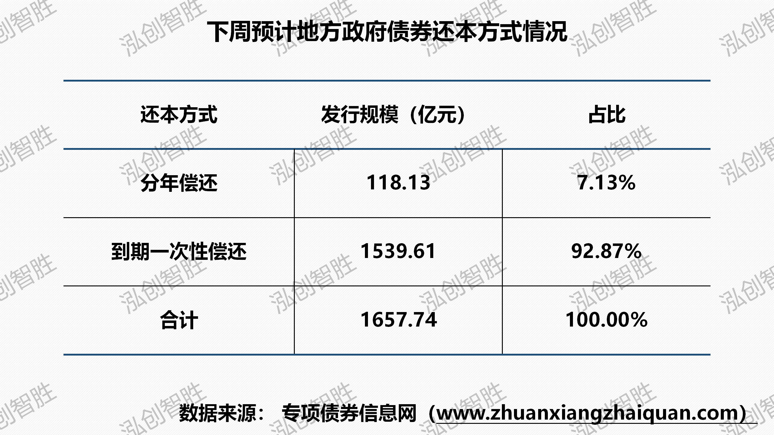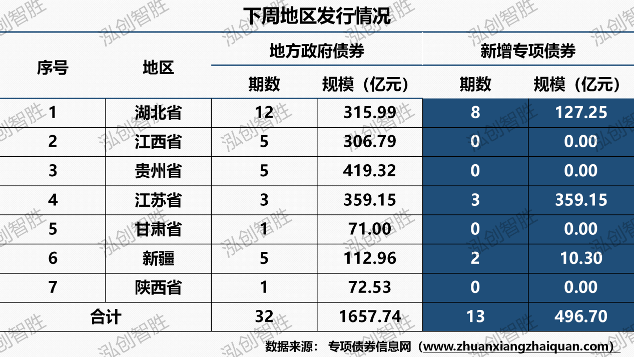 新增债券569亿元(含专项债券497亿元),再融资债券1089亿元。下周预计共有七个地区(湖北、江西、贵州、江苏、甘肃、新疆、陕西)计划发行32期地方政府债券,发行规模1658亿元。其中,新增专项债券13期,发行规模497亿元。下周预计发行地方政府债券平均期限为10.69年,其中新增专项债券平均期限12.71年。下周预计发行新增专项债券涉及六种期限类型,5年期、7年期、10年期、15年期、20年期、30年期。其中5年期发行1.60亿元,占比为0.32%;7年期发行55.52亿元,占比为11.18%;10年期发行313.50亿元,占比为63.12%;15年期发行31.76亿元,占比为6.39%;20年期发行52.22亿元,占比为10.51%;30年期发行42.10亿元,占比为8.48%。下周共发行32期地方政府债券,发行规模合计1657.74亿元。其中,采取分年还本债券5期,发行规模合计118.13亿元,其他期债券还本方式均采取到期一次性还本。