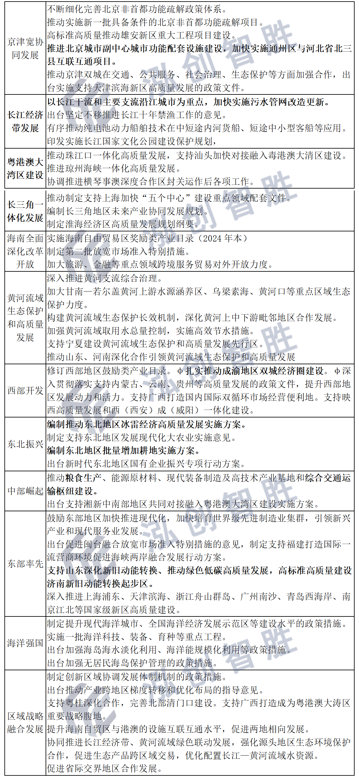 资料来源:《2023年国民经济运行情况及2024年草案》新质生产力+全国统一大市场,这是未来经济发展政策的两大主线,包括区域协调发展、新型城镇化、城乡融合发展和乡村振兴。其中超长期特别国债主要支持区域协调中的重点区域和新型城镇化地区中农业人口流入地区。(1)区域协调发展。其中与新质生产力紧密相关的长江经济带、粤港澳大湾区建设、长三角一体化发展为重点支持区域。可参考2024年促进区域协调发展和融合发展的政策举措进行申报、谋划。图表4:2024年促进区域协调发展和融合发展的政策举措