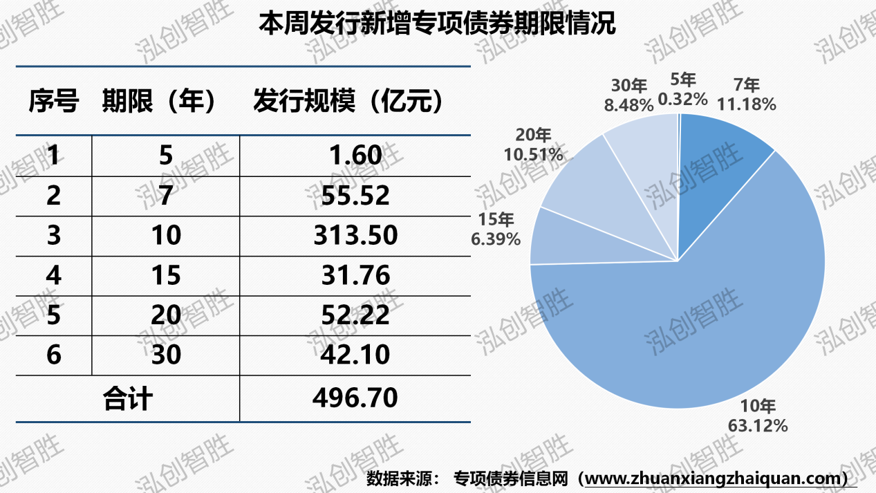 本周发行新增专项债券涉及六种期限类型,5年期、7年期、10年期、15年期、20年期、30年期。其中5年期发行1.60亿元,占比为0.32%;7年期发行55.52亿元,占比为11.18%;10年期发行313.50亿元,占比为63.12%;15年期发行31.76亿元,占比为6.39%;20年期发行52.22亿元,占比为10.51%;30年期发行42.10亿元,占比为8.48%。