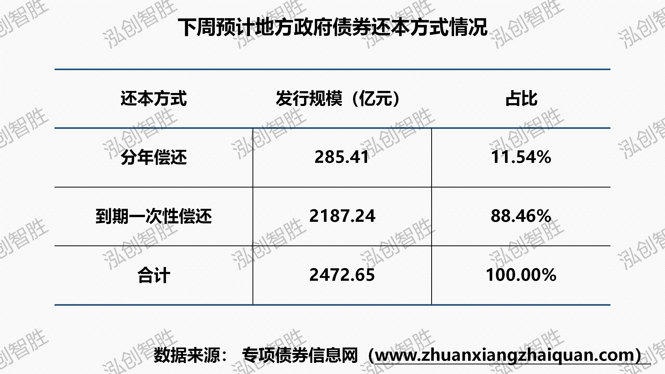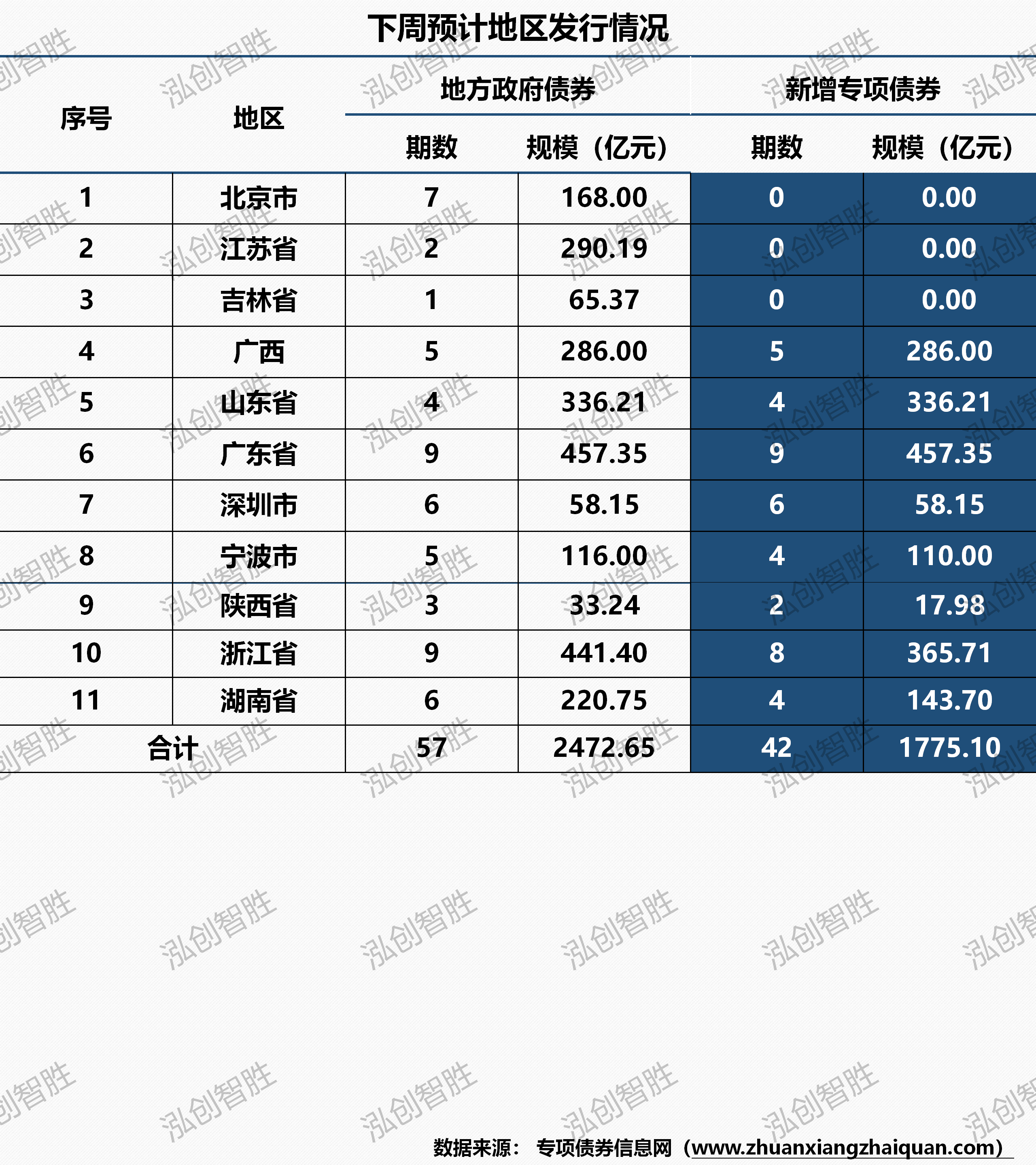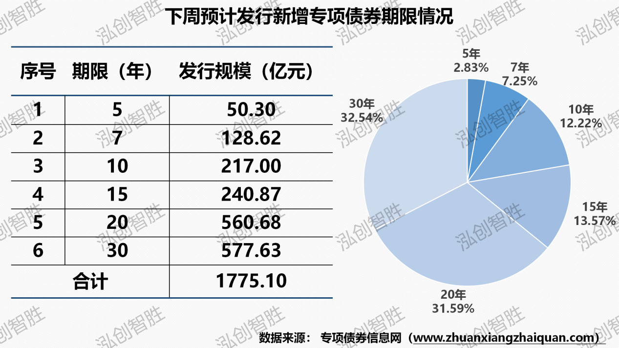 新增债券1873亿元(含专项债券1775亿元),再融资债券599亿元。广西计划发行1期支持中小银行发展专项债券,计划发行规模为60.2亿元。宁波计划发行1期新增一般债券柜台债券,柜台债发行规模为3亿元。下周预计共有十一个地区(北京、江苏、吉林、广西、山东、广东、深圳、宁波、陕西、浙江、湖南)计划发行57期地方政府债券,发行规模2473亿元。其中,新增专项债券42期,发行规模1775亿元。下周预计发行地方政府债券平均期限为16.39年,其中新增专项债券平均期限19.99年。下周预计发行新增专项债券涉及六种期限类型,5年期、7年期、10年期、15年期、20年期、30年期。其中5年期发行50.30亿元,占比为2.83%;7年期发行128.62亿元,占比为7.25%;10年期发行217.00亿元,占比为12.22%;15年期发行240.87亿元,占比为13.57%;20年期发行560.68亿元,占比为31.59%;30年期发行577.63亿元,占比为32.54%。下周共发行57期地方政府债券,发行规模合计2472.65亿元。其中,采取分年还本债券8期,发行规模合计285.41亿元,其他期债券还本方式均采取到期一次性还本。