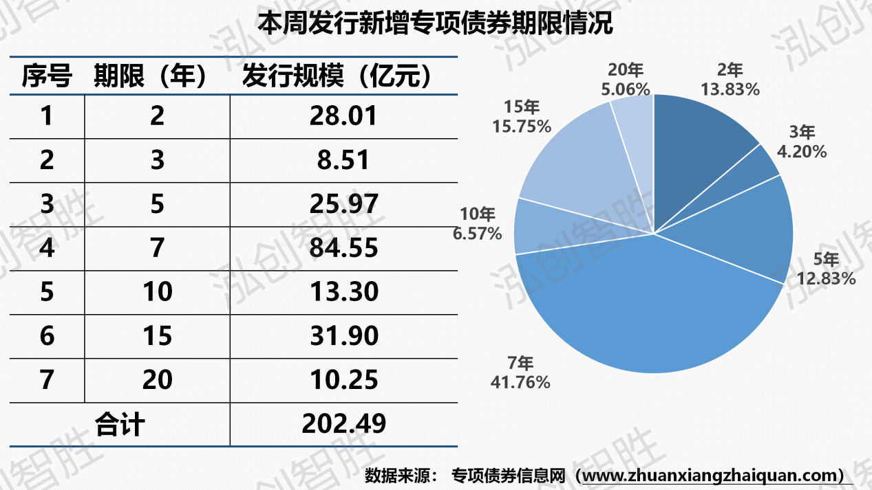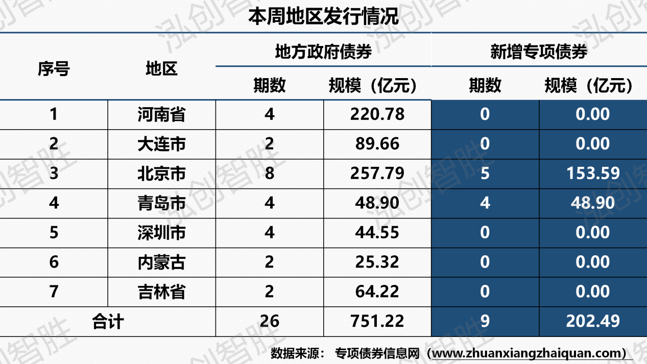 其中,新增债券271亿元(含专项债券202亿元);本周共有七个地区(河南、大连、北京、青岛、深圳、内蒙古、吉林)计划发行26期地方政府债券,发行规模751亿元;其中,计划发行9期新增专项债券,发行规模202亿元。本周发行地方政府债券平均期限为8.40年,新增专项债券平均期限9.74年。本周发行新增专项债券涉及七种期限类型,2年期、3年期、5年期、7年期、10年期、15年期、20年期。其中,2年期发行28.01亿元,占比为13.83%;3年期发行8.51亿元,占比为4.20%;5年期发行25.97亿元,占比为12.83%;7年期发行84.55亿元,占比为41.76%;10年期发行13.30亿元,占比为6.57%;15年期发行31.90亿元,占比为15.75%;20年期发行10.25亿元,占比为5.06%。本周共发行26期地方政府债券,发行规模合计751.22亿元。均采取到期一次性还本。