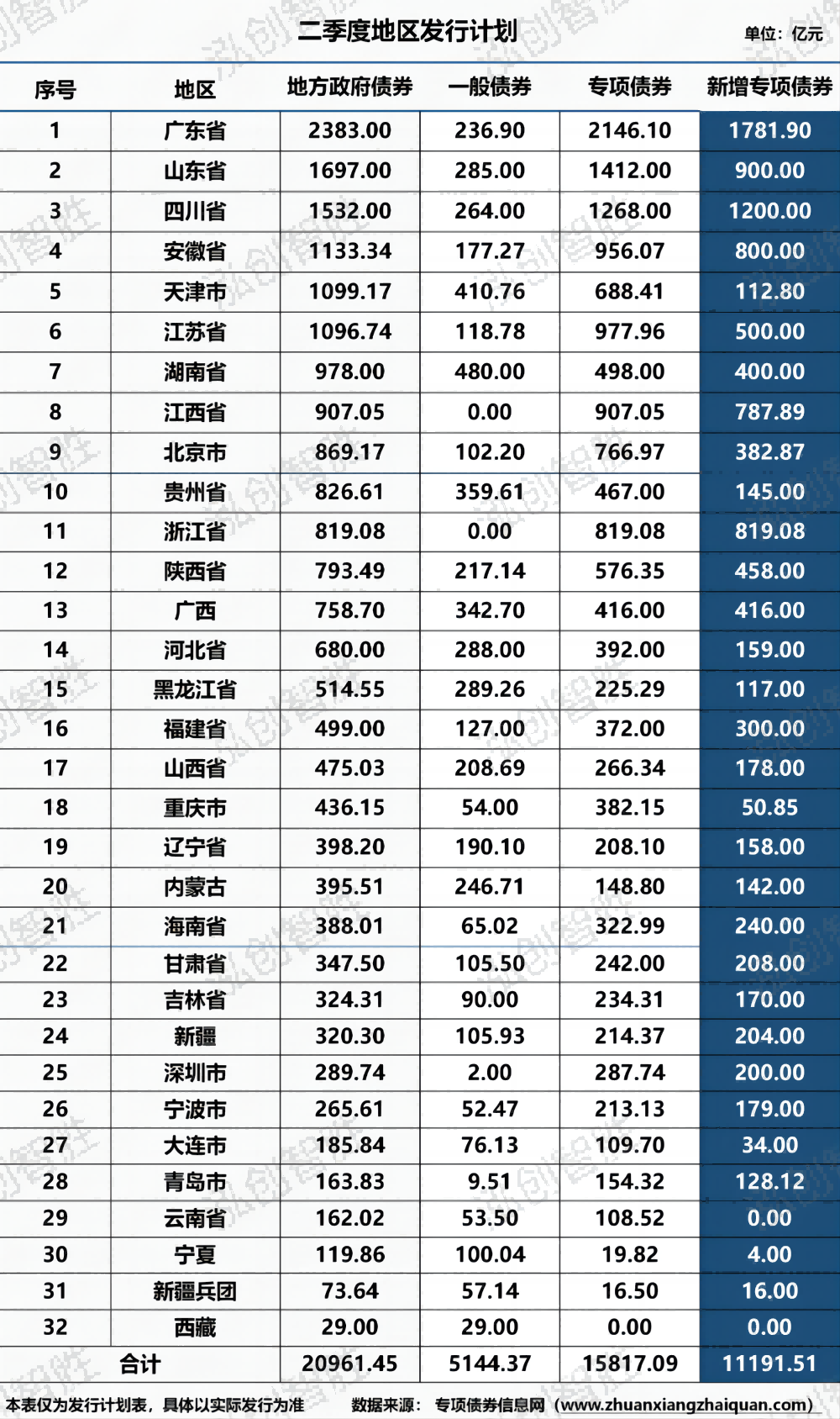 截至4月14日,32个发行主体中地方政府债券计划发行规模前三的地区为:广东、山东、四川;新增专项债券计划发行规模超千亿元的涉及两个地区,分别为:广东、四川,发行规模超500亿元的涉及四个地区:山东、浙江、安徽、江西。