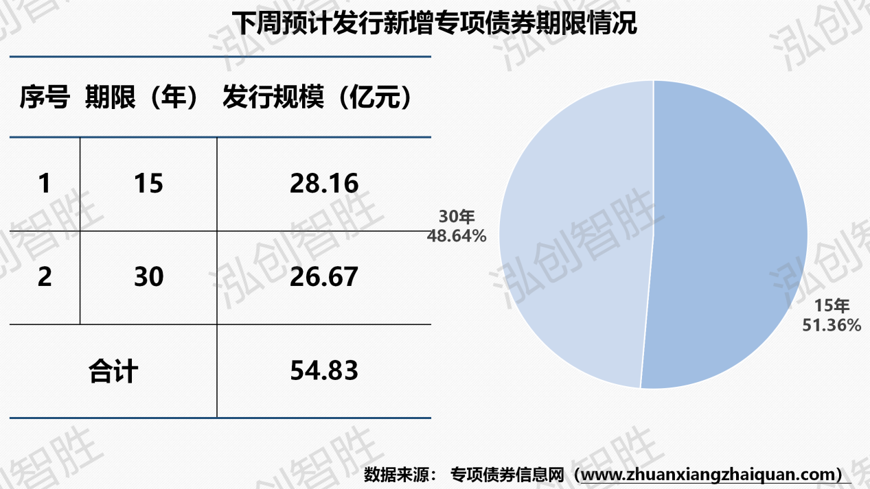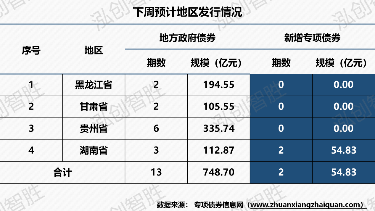 下周预计共有四个地区(黑龙江、甘肃、贵州、海南)计划发行13期地方政府债券,发行规模749亿元;其中,计划发行2期新增专项债券,发行规模55亿元。下周预计发行地方政府债券平均期限为12.13年,新增专项债券平均期限22.30年。本周发行新增专项债券涉及两种期限类型,15年期、30年期。其中,15年期发行28.16亿元,占比为51.36%;3年期发行26.67亿元,占比为48.64%。下周共发行13期地方政府债券,发行规模合计748.70亿元。均采取到期一次性还本。