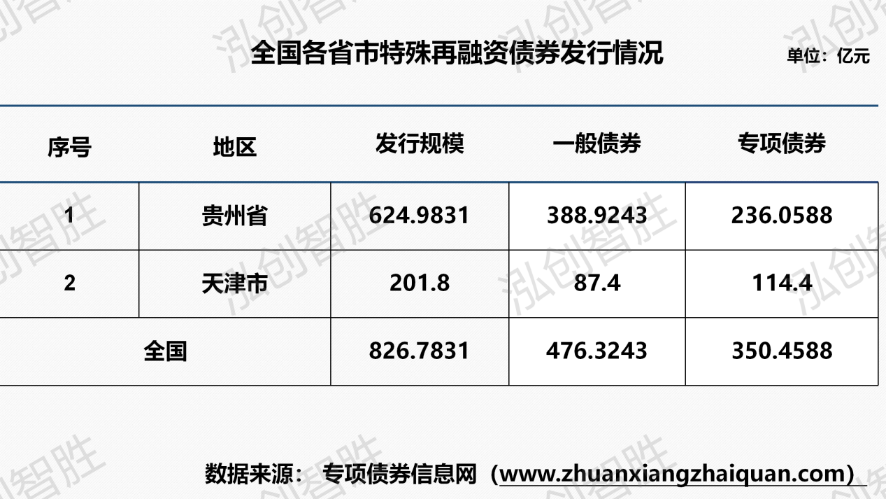 截至4月14日,全国发行特殊再融资债券826.7831亿元,其中再融资一般债券476.3243亿元,再融资专项债券350.4588亿元。贵州省拟于下周发行2024年第四批特殊再融资债券,本批次计划发行特殊再融资债券84.79亿元;2期期限为10年期的特殊再融资一般债券, 计划发行规模26.6466亿元;1期期限为30年期的特殊再融资专项债券,计划发行规模58.1464亿元。