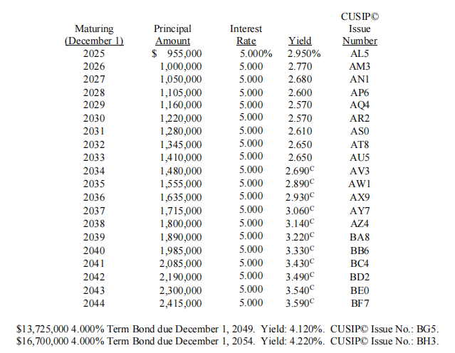 科罗拉多州大章克申市占地约42.36平方英里,位于70号州际公路(“I-70”)走廊上,丹佛以西约250英里,犹他州边界以东27英里。这座城市的目前估计人口约为68,034人。科罗拉多州大章克申市北迄国土资源管理局的土地,南至科罗拉多国家纪念碑。科罗拉多州大章克申市是该州的一个地方自治的市政单位。它最初成立于1882年,并在1909年通过地方自治宪章成为一个自治市。该宪章管理着所有的地方和市政事务。州法律仅适用于地方或市政有关的未被地方自治宪章或城市条例所明确的事项。州宪法保留了对该市的某些管辖权,包括发行、退款和清算各种市政债务的权力,以及评估财产的权力,并对市政服务设施的相关财产征税。该债券将以完全注册的形式发行,发行后将以Cede&Co.作为债券的名义持有人。债券期望发行时间为2024年2月21日,共发行$62,000,000(详见表1)。债券从2024年1月29日开始支付利息,并在之后每半年支付一次利息,即每年的6月1日和12月1日付息,直至到期或提前赎回为止。该最小发行额为5,000.00美元,并可以以5,000.00的整数倍进行购买。标准普尔全球评级公司(STANDARD & POOR)根据保险人签发的保单,给出“AA”评级;根据该县提供的文件和其他信息给出“A-”评级。(详见表2)表1债券分期发行情况表(美元)