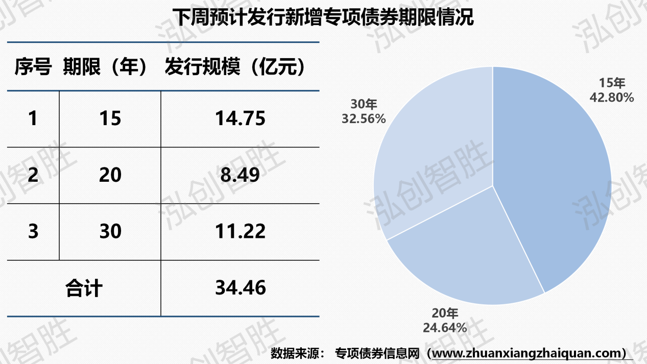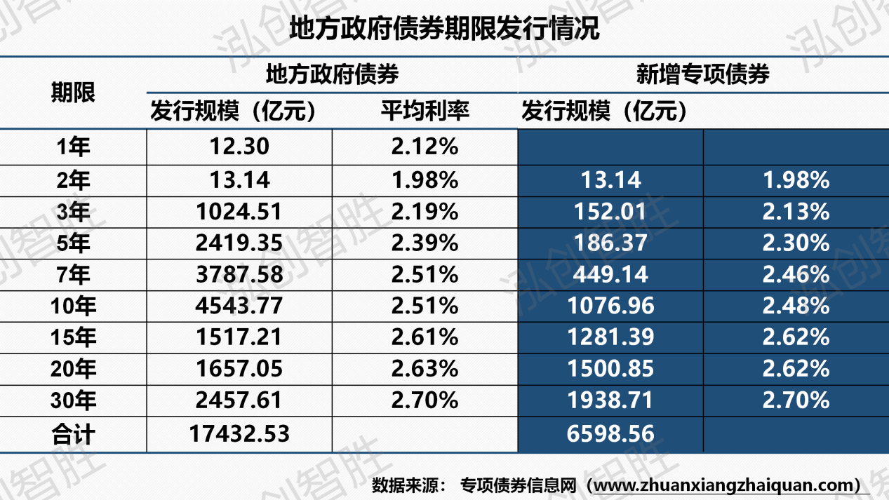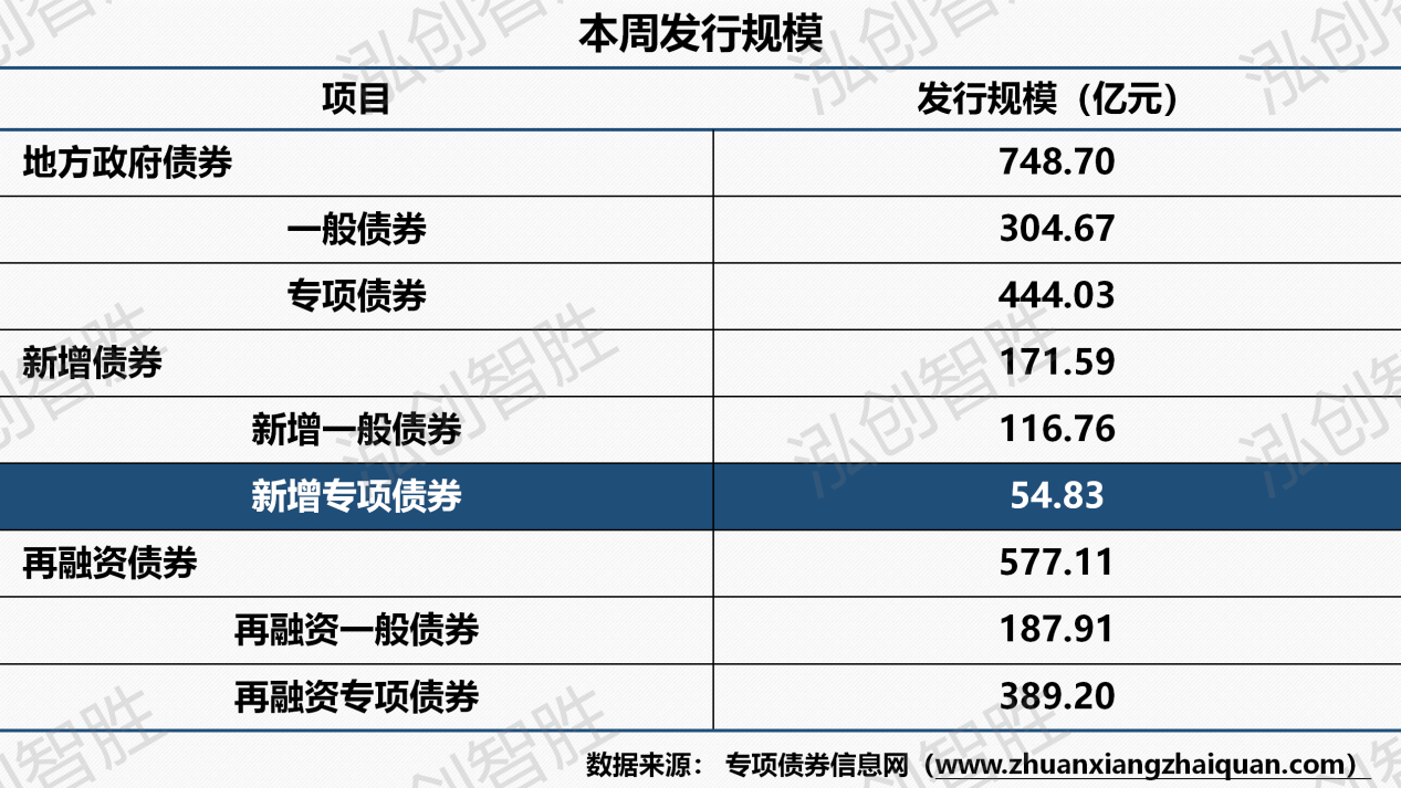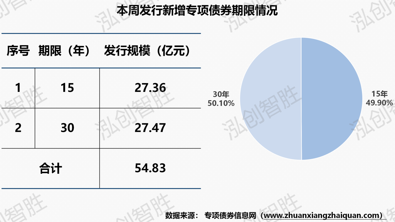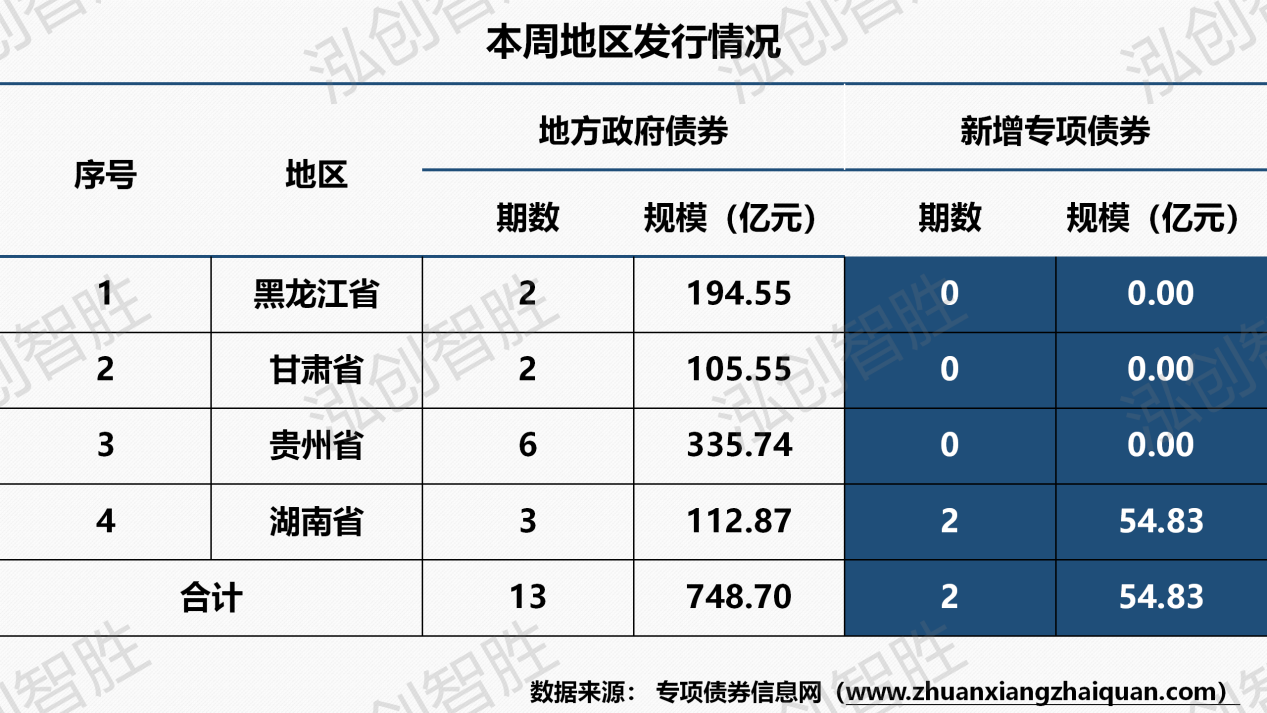 本周共有四个地区(黑龙江、甘肃、贵州、海南)发行13期地方政府债券,发行规模749亿元;其中,成功发行2期新增专项债券,发行规模55亿元。注:因湖南涉及两期新增专项债券披露文件中发行规模调整(15年期由28.16亿元调整为27.36亿元;30年期由26.67亿元调整为27.47亿元),导致上周计划发行平均期限与本周实际发行平均期限存在差异。本周发行地方政府债券平均期限为12.25年,新增专项债券平均期限22.52年。本周发行新增专项债券涉及两种期限类型,15年期、30年期。其中,15年期发行27.36亿元,占比为49.90%;30年期发行27.47亿元,占比为50.10%。本周共发行13期地方政府债券,发行规模合计748.70亿元。还本方式均采取到期一次性还本。