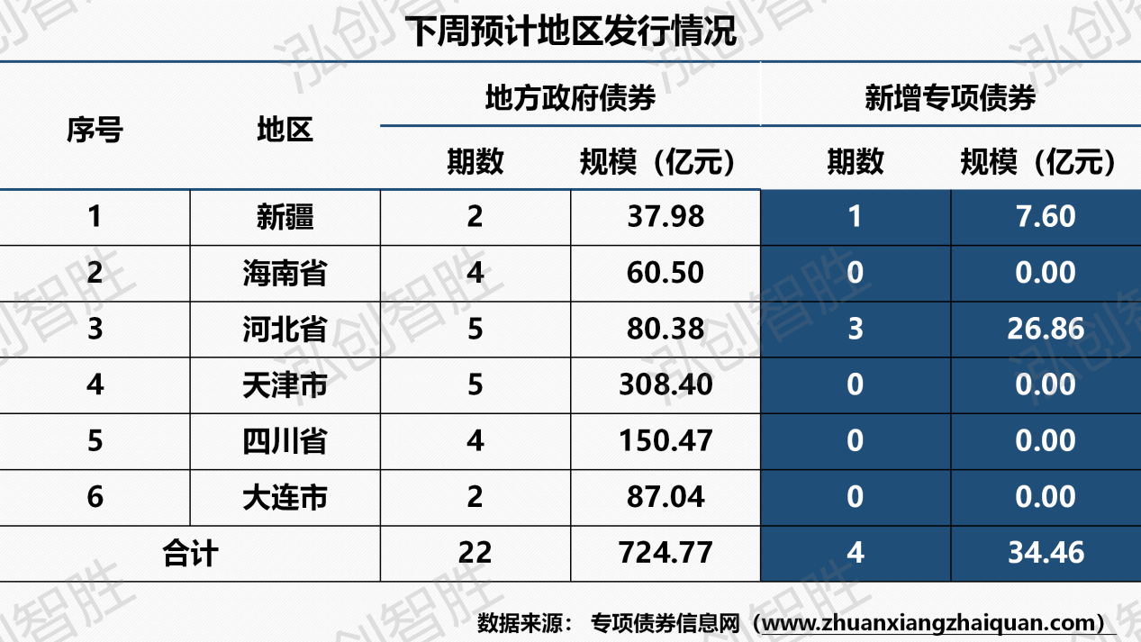 大连计划发行1期再融资一般债券柜台债,计划发行规模1亿元。下周预计共有六个地区(新疆、海南、河北、天津、四川、大连)计划发行22期地方政府债券,发行规模725亿元;其中,计划发行4期新增专项债券,发行规模34亿元。下周预计发行地方政府债券平均期限为8.23年,新增专项债券平均期限21.12年。下周预计发行新增专项债券涉及三种期限类型,15年期、20年期、30年期。其中,15年期发行14.75亿元,占比为42.80%;20年期发行8.49亿元,占比为24.64%;30年期发行11.22亿元,占比为32.56%。下周共发行22期地方政府债券,发行规模合计724.77亿元;其中,河北涉及三期新增专项债券采取分年还本,预计发行规模为26.86亿元,占比为3.71%。附表1:2018-2024年地方政府债券月发行情况