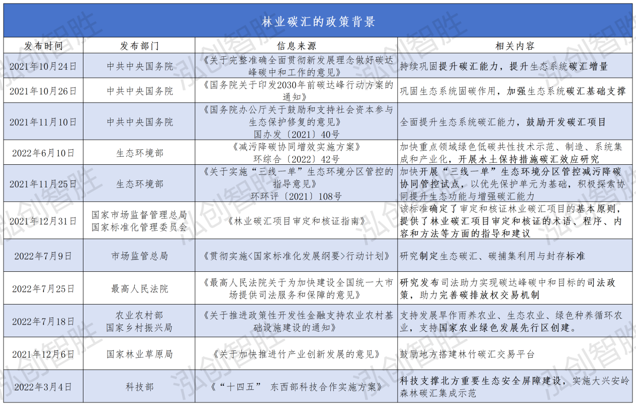 碳汇一般是指从空气中清除二氧化碳的过程、活动、机制。主要是指森林吸收并储存二氧化碳的多少,或者说是森林吸收并储存二氧化碳的能力。自然界中只要具有吸收和固定二氧化碳的作用的物质,如海洋、森林、土壤、岩石、生物体等,这些都可以产生碳汇,因此就有林业碳汇、草地碳汇、耕地碳汇、土壤碳汇、海洋碳汇等概念。草地碳汇:草原生态系统有很强的碳蓄积能力,主要将吸收的二氧化碳固定在地下的土壤当中,植物的固碳比例较小,仅占一成左右,多年生草本植物的固碳能力更强,随着我国退耕还林、还草工程的实施,尤其是退化草地的固碳增量更加明显,因此可充分发挥草地的固碳作用。这些潜在的碳汇将在全球碳循环中发挥重要的作用。但有学者认为,草地的固碳具有非持久性,易泄露,因此估算结果具有较大不确定性。耕地碳汇:耕地固碳仅涉及农作物秸秆还田固碳部分,原因在于耕地生产的粮食每年都被消耗,其固定的二氧化碳又被排放到大气中,秸秆的一部分还可能被直接燃烧。只有作为农业有机肥的部分,才将二氧化碳固定到了耕地的土壤中。土壤碳汇:根据“酶锁理论”,土壤微生物可作碳“捕集器”,以减少大气中的温室气体。但2021年7月,发表在《自然-通讯》的实验结果表明土壤微生物在无氧条件下能分解多酚类物质,且可能会释放二氧化碳,这些实验结果与“酶锁理论”背道而驰。海洋碳汇:是将海洋作为一个特定载体吸收大气中的二氧化碳,并将其固化的过程和机制。地球上超过一半的生物碳和绿色碳是由海洋生物(浮游生物、细菌、海草、盐沼植物和红树林)捕获的,单位海域中生物固碳量是森林的10倍,是草原的290倍。尽管碳汇类型不止一种,但能开发且充当“碳汇”主要角色的,却暂时只有林业碳汇,其余碳汇的相关方法学正在研究开发中,相比较,林业碳汇有相对完善的政策和广泛的值得研究的案例,因此,本文主要以林业碳汇为载体展开研究。注:酶锁理论认为,在湿地、泥炭地等地,当氧气无法自由获取时,土壤微生物不会代谢多酚。如果多酚类物质在无氧土壤中不会被分解,那就意味着用这些化合物填充土壤可能成为一个碳汇。当前,气候变化已成为全球可持续发展面临的最严峻挑战之一,在此背景下,基于自然的解决方案得到了广泛的关注和发展。2021年国务院印发《2030年前碳达峰行动方案》,明确提出持续巩固提升碳汇能力的重大任务,部署碳汇能力巩固提升行动。森林作为陆地生态系统的主体,其碳汇能力将在应对气候变化中发挥举足轻重的作用。随着我国“双碳”目标的提出,加强林业碳汇能力是我国确保碳达峰和碳中和目标顺利实现的的重点工作之一。定义:林业碳汇是指利用森林的储碳功能,通过植树造林、森林经营等活动,吸收和固定大气中的二氧化碳,并按相关规则,将项目固碳量进行碳汇交易,达到减少二氧化碳排放的目的。重要性:森林是陆地生态系统中最大的碳库,在降低大气中温室气体浓度、减缓全球气候变暖中,具有十分重要的独特作用。扩大森林覆盖面积是未来30-50年经济可行、成本较低的重要减缓措施。许多国家和国际组织都在积极利用林业碳汇应对气候变化。