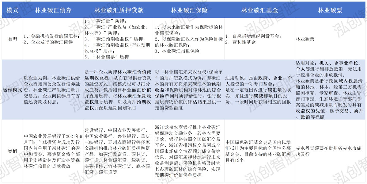 发展林业碳汇长期以来是我国碳汇政策的主要内容,在新时期被赋予更迫切的要求。林业碳汇是目前世界上最为经济的“碳吸收”手段。中国政府一直十分重视林业,从上世纪80年代末开始,我国便大力开展植树造林行动。至今我国森林面积增长了近一倍。过去40年间,我国通过造林新增森林面积的碳汇贡献约占中国森林碳汇总量的40%-50%,全球约1/4的新增绿化面积来自中国。近十年来,我国累计完成国土绿化面积16.8亿亩,森林覆盖率超过24%,我国成为全球森林资源增长最快的国家。中国对国际社会承诺,二氧化碳排放力争于2030年前达到峰值,努力争取2060年前实现碳中和。全国将建立统一的碳排放交易市场,林业碳汇项目将作为全国碳市场的重要抵消机制项目,不仅有助于控排企业实现低成本履约,同时也为林业获得额外融资渠道,有助于促进林业的可持续发展。为解决林业碳汇项目开发和维护周期长、资金需求多与实际融资渠道少的具体资金困境,金融支持林业碳汇的机制和业务创新不断发展,交易所、商业银行、保险公司等机构在林业碳汇金融应用方面进行了很多努力和探索,推出了林业碳汇债券、林业碳汇质押贷款、林业碳汇保险、林业碳汇基金、林业碳汇远期交易、林业碳汇回购等多种金融工具支持手段,以此促进林业碳汇的发展,助力国家“双碳”战略目标实现,5种融资模式具体内容如下图所示:林业碳汇债券。2021年出台的《绿色债券支持项目目录(2021年版)》明确碳汇林可申请绿色债券。林业碳汇债券主要分为两种类型:(1)金融机构发行的碳汇债券;(2)企业发行的碳汇债券。对于后者,林业碳汇供给企业直接向公众发行债券融资,林业碳汇产生碳汇量并交易后,企业向债券持有方偿还贷款及利息。林业碳汇质押贷款。林业碳汇质押贷款是现阶段实践应用最广的林业碳汇融资方式,主要有五种融资模式:“碳汇量”质押、“碳汇+产业收益(如农业、林业等)”质押、“碳汇预期收益权”质押、“碳汇预期收益权+产业预期收益权”质押以及“林业碳票”质押。其中,“碳汇+产业收益”质押和“碳汇预期收益权”质押是目前最主要的两种碳汇融资模式,融资规模占比最高。林业碳汇保险。林业碳汇保险领域目前主要有三类业务:(1)以未来碳汇量作为保险标的林业碳汇保险;(2)以保障碳汇收入作为保险目标的林业碳汇保险,(3)林业碳汇指数保险,保险标的是森林所带来的碳汇功能。林业碳汇保险的目的是保障林业所产生的富余价值、生态环保价值、碳汇恢复期间耗损、固碳能力修复成本以及碳排放权交易价值。林业碳汇基金。根据设立目的,基金可以分为两类:一种是自愿捐赠组织创设基金;另一种是营利性基金。基金资金来源方式包括:政府全部承担所有出资;由政府和企业按比例共同出资;由政府通过征税的方式出资;由企业自行募集的方式。其中,由政府和企业按比例共同出资方式比较常见,该方式比较灵活,且筹资速度快、数量大。林业碳票。全国多地在林权制度改革和林票制度改革的基础上探索林业碳票应用,福建省三明市、安徽省滁州市、贵州省毕节市等地相继出台了当地的林业碳票管理办法和林业碳票碳减排量计量方法,创新林业碳汇价值实现渠道。作为林木碳减排量收益权的凭证,林业碳票被赋予交易、质押、兑现、抵消等功能价值。