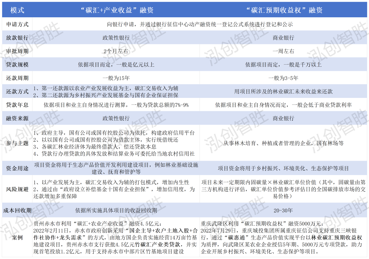 以上介绍了5种比较常见的林业碳汇融资模式,其中,林业碳汇质押贷款是现阶段实践应用最广的、披露信息最多的林业碳汇融资方式,又在林业碳汇质押贷款细分领域中,“碳汇+产业收益”融资和“碳汇预期收益权”融资规模占比最高,两种融资模式具体情况如下图所示:对比两种融资模式可知,“碳汇+产业收益”融资放款银行为政策银行,审批周期更长、贷款规模更大、还款周期更长、还款方式更多元,贷款年息相对更高;“碳汇预期收益权”融资放款银行为商业银行,审批周期较短、贷款规模较小、还款周期较短、还款方式主要为林业碳汇未来收益,贷款年息相对较低。发展林业碳汇可以使森林具有更强大的碳汇功能,促进生物多样性保护。林业碳汇行为对水土保持和涵养水源也起到重要的促进作用。此外,林业碳汇还能够调节气候,降低大气中温室气体的浓度,减缓气候变暖。通过实施林业碳汇项目不仅可以推动我国林区的经济发展、加速我国林业的生态化进程,还能助力乡村振兴、推进生态文明建设、增强生态产品生产能力、建设美丽中国。因此,坚定深入践行绿水青山就是金山银山的理念,坚持降碳、减污、扩绿、增长协同推进,加快布局“双碳”发展新赛道,各省市还在不断探索林业碳汇融资新模式,比如“碳汇+生态司法”、“林业碳汇质押贷款+远期约定回购”、“林业碳汇未来收益权+保险单”、“单株碳汇精准扶贫贷款”、“个人碳汇贷款”、“一元碳汇模式”等。未来还可能在碳基金、碳债券、碳信托等方面进一步探索,创新碳金融产品,推动绿色金融发展,助力转化生态价值。