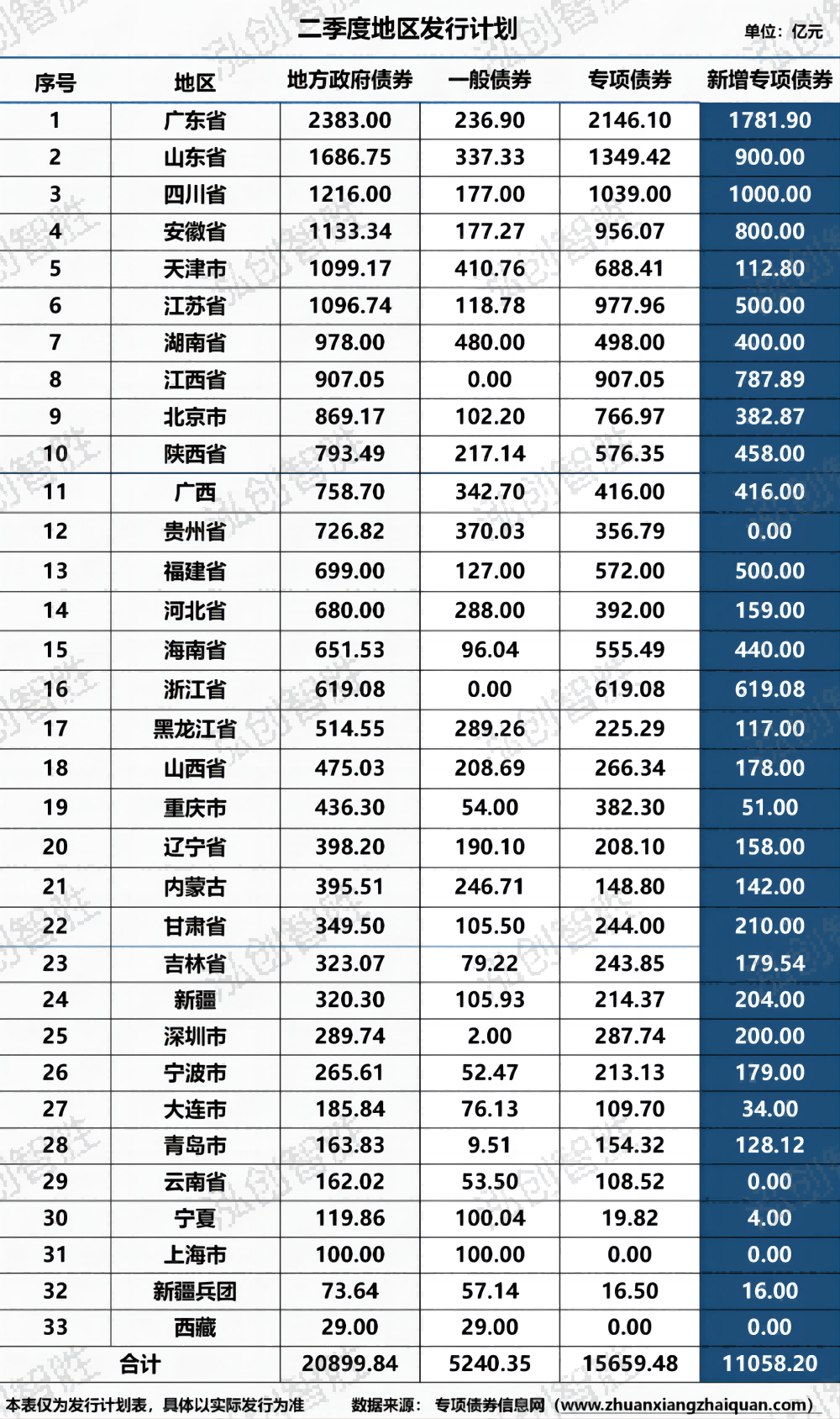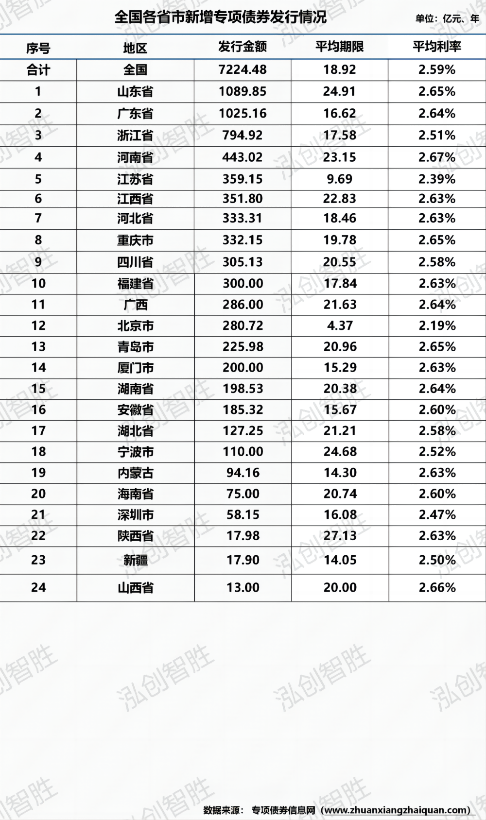 截至5月5日,全国发行特殊再融资债券835.7831亿元,其中再融资一般债券476.3243亿元,再融资专项债券359.4588亿元。截至5月5日,2024年全国33个发行主体已成功发行390期地方政府债券,已发行规模为19178亿元。其中,专项债券12803亿元,一般债券6375亿元;其中,新增债券9708亿元(含专项债券7224亿元);再融资债券9470亿元。截至5月5日,33个发行主体中,地方政府债券发行规模超过1000亿元的涉及六个地区,分别为广东、山东、浙江、江苏、贵州、四川;仅上海、青海、新疆兵团、西藏4个发行主体还未发行地方政府债券。其中,发行新增专项债券涉及24个发行主体,发行规模前三的地区为:山东1089.85亿元、广东1025.16亿元、浙江794.92亿元。截至5月5日,2024年地方政府债券已发行19178亿元,平均期限12.51年,平均利率2.51%。截至5月5日,2024年新增专项债券已发行7224亿元,平均期限18.92年,平均利率2.59%。新增专项债券平均期限排名前三的地区分别为陕西27.13年、山东24.91年、宁波24.68年。截至5月5日,全国已发行的390期地方政府债券,发行规模合计19177.71亿元,其中采取分年还本的债券35期,涉及金额1305.40亿元,占总发行规模的6.81%,全部为新增专项债券;其余债券均采取到期一次性还本。其中,分年还本规模最大为河南,其发行规模377.34亿元;占全省地方政府债券发行规模的37.96%,占全省新增专项债券发行规模的85.17%。截至5月5日,33个发行主体已披露二季度地方债券发行计划,计划发行地方政府债券20900亿元,其中新增债券13196亿元(含专项债券11058亿元),再融资债券7704亿元。注:贵州5月计划发行地方政府一般债券82.0886亿元、专项债券99.1219亿元,均未披露债券性质,暂时按再融资专项债券和再融资一般债券进行统计。截至5月5日,33个发行主体中地方政府债券计划发行规模前三的地区为:广东、山东、四川;新增专项债券计划发行规模超千亿元的涉及两个地区,分别为:广东、四川,发行规模超500亿元的涉及四个地区:山东、浙江、安徽、江西。