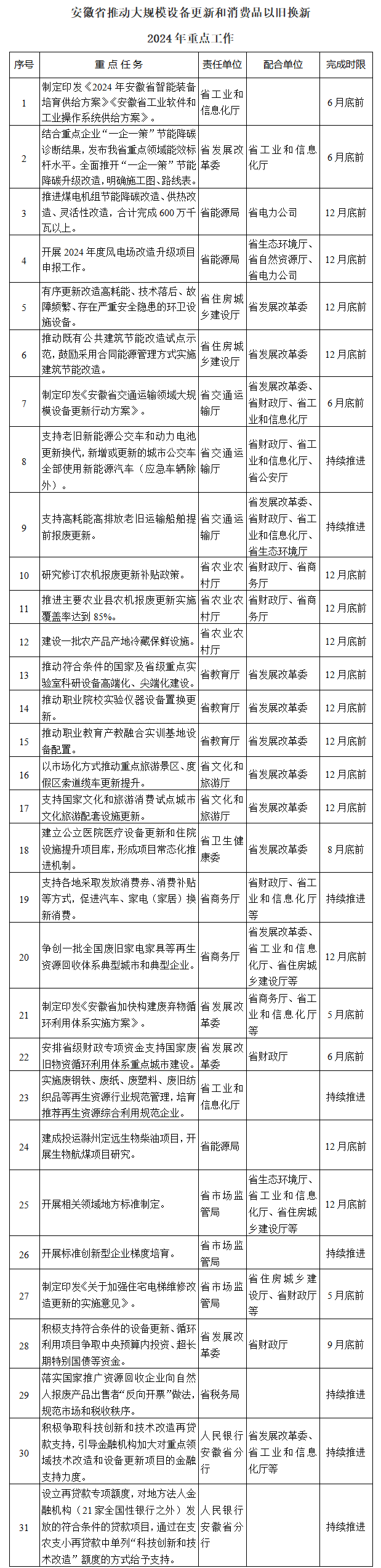 信息来源 安徽省政府 各市、县人民政府,省政府各部门、各直属机构: 现将《安徽省推动大规模设备更新和消费品以旧换新实施方案》印发给你们,请认真贯彻落实。 安徽省人民政府 2024年5月20日 安徽省推动大规模设备更新和消费品 以旧换新实施方案 为贯彻落实党中央、国务院关于推动大规模设备更新和消费品以旧换新决策部署,按照《国务院关于印发〈推动大规模设备更新和消费品以旧换新行动方案〉的通知》(国发〔2024〕7号)要求,结合我省实际,制定本实施方案。 一、总体要求 坚持以习近平新时代中国特色社会主义思想为指导,全面贯彻党的二十大精神,认真落实党中央、国务院决策部署及省委、省政府工作要求,统筹扩大内需和深化供给侧结构性改革,深入实施设备更新、消费品以旧换新、回收循环利用、标准提升四大行动,坚持市场为主、政府引导,坚持鼓励先进、淘汰落后,坚持标准引领、有序提升,进一步释放投资和消费潜力,培育新质生产力,加快推动高质量发展。 到2027年,工业、农业、建筑、交通、教育、文旅、医疗等领域设备投资规模较2023年增长25%以上;重点行业主要用能设备能效基本达到节能水平,环保绩效达到A级水平的产能比例大幅提升,规模以上工业企业数字化研发设计工具普及率、关键工序数控化率分别超过90%、75%;报废汽车回收量较2023年增加约一倍,二手车交易量较2023年增长45%以上,废旧家电回收量较2023年增长30%以上,再生材料在资源供给中的占比进一步提升。 二、实施重点领域设备更新行动 (一)推进工业领域设备更新和技术改造。聚焦钢铁、有色、石化、化工、建材、电力、机械、航空、船舶、轻纺、电子、印染等重点行业,以数字化、智能化、绿色化为重点方向,全面摸排设备更新需求,分行业确定设备更新重点,统筹有序推进重点领域生产设备、用能设备、发输配电设备、起重机械、叉车等更新和技术改造。探索建立技术改造服务中心等公共服务平台,培育引进一批专业化设备更新改造服务商。加快安全工艺技术和安全装备推广应用,加快推进老旧石化化工装置更新。严格落实能耗、排放、质量、安全等强制性标准和设备淘汰目录,依法依规淘汰不达标设备。到2027年,每年滚动实施亿元以上重点技术改造项目1200个以上。(责任单位:省工业和信息化厅,配合单位:省发展改革委、省生态环境厅、省应急管理厅、省市场监管局、省能源局,各市人民政府。以下均需各市人民政府落实,不再列出) (二)推动工业和制造业数字化转型。推广应用智能制造设备和软件,出台工业软件替代方案,加快工业互联网建设和普及应用。加快数字基础设施建设进度,协同推进基础能力提升、内网改造、外网升级、5G融合应用,鼓励数据中心、通信基站等能效先进水平设备的应用比例。鼓励企业建设智能制造单元、智能生产线、数字化车间、智能工厂,加快数字化转型步伐。鼓励企业推进数字化管理、平台化设计、网络化协同、智能化制造等新模式新业态,加快形成一批可复制可推广的典型模式和应用场景。到2027年,培育省级数字化车间和智能工厂800家。(责任单位:省工业和信息化厅,配合单位:省数据资源局) (三)推动分行业分领域节能降碳改造。聚焦煤电、钢铁、焦化、有色、化工、建材、印染等重点行业,以《重点用能产品设备能效先进水平、节能水平和准入水平(2024年版)》和现行能耗、污染物排放等强制性国家标准为基本依据,鼓励企业开展节能诊断和能效对标,加快推动工业窑炉、锅炉、压缩机、泵、电机、变压器等重点用能设备系统更新改造,鼓励更新改造后达到能效节能水平(能效2级),并力争达到能效先进水平(能效1级)。研究制定分行业节能降碳专项行动方案,明确改造目标和时限,加大帮扶指导力度,引导企业全面提升设备水平。积极实施能效“领跑者”行动。持续推进存量煤电机组节煤降耗改造、供热改造、灵活性改造。到2027年,重点行业主要用能设备能效基本达到节能水平。(责任单位:省发展改革委,配合单位:省工业和信息化厅、省生态环境厅、省市场监管局、省能源局) (四)推进建筑和市政基础设施设备更新。推进住宅电梯维修改造更新,开展安全评估工作,加快更新不符合现行产品标准、安全风险高的住宅老旧电梯。结合隐患排查或安全风险评估情况,推动交付年限15年以上的住宅老旧电梯进行更新、改造或大修。(责任单位:省市场监管局,配合单位:省住房城乡建设厅、省财政厅)稳步推进既有住宅加装电梯。实施自来水厂内及居民小区二次供水(加压调蓄)设施设备、燃煤锅炉及换热器等供热设备更新改造。加快推进燃气等老化管道更新改造,运行年限满20年的燃气管道应改尽改。推进液化石油气充装站标准化建设,更新改造检验不合格、超出使用寿命、存在安全隐患且无维修价值的设备设施,更新不符合现行国家标准要求的钢瓶。以外墙保温、外窗等为重点,推进既有建筑节能改造。加快推进城镇生活污水垃圾处理设施设备补短板、强弱项。有序推动地下管网、桥梁隧道等城市生命线工程配套物联网感知设备建设,加快重点公共区域和道路视频监控等安防设备改造。到2027年,新建或改扩建城镇生活污水处理能力120万吨/日,完成既有公共建筑节能改造600万平方米,城镇新建建筑设计、施工100%执行建筑节