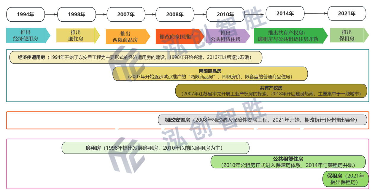 从1994年国务院发布的《关于深化城镇住房制度改革的决定》(国发〔1994〕43号)中明确“建立以中低收入家庭为对象、具有社会保障性质的经济适用住房供应体系和以高收入家庭为对象的商品房供应体系”的住房“双轨供应”体系,到2021年国务院办公厅出台《关于加快发展保障性租赁住房的意见》(国办发〔2021〕22号)文件中首次明确我国的住房保障体系是以公共租赁住房、保障性租赁住房和共有产权住房为主体,至此,我国“三位一体”的住房保障体系正式确立。公共租赁住房(简称公租房)是指由政府主导投资、建设和管理,或由政府提供政策支持、其他各类主体投资筹集、纳入政府统一管理,限定建设标准和租金水平,租赁给符合条件的城镇中等偏下及以下收入住房困难家庭、新就业无房职工和在城镇稳定就业的外来务工人员的保障性住房。